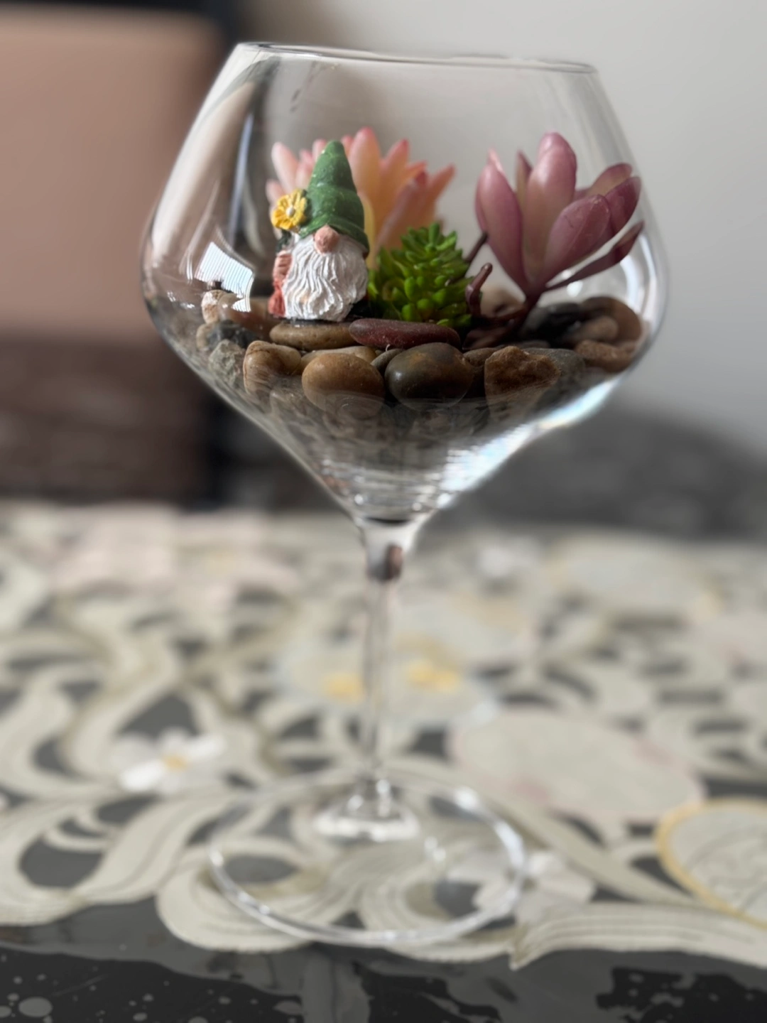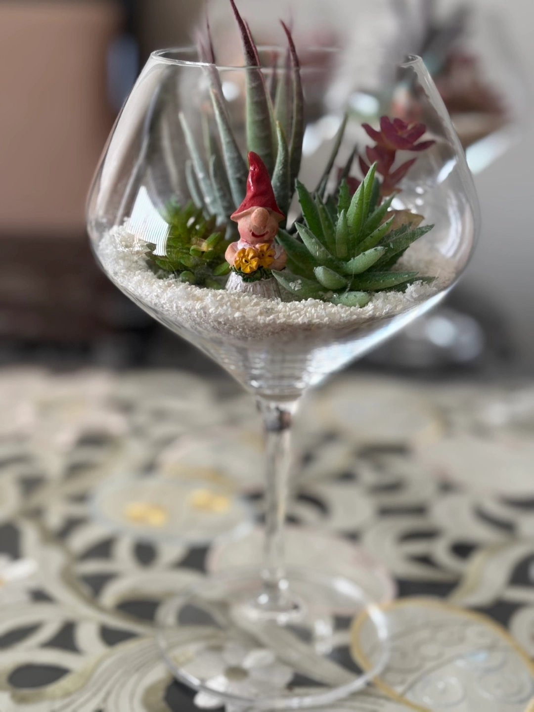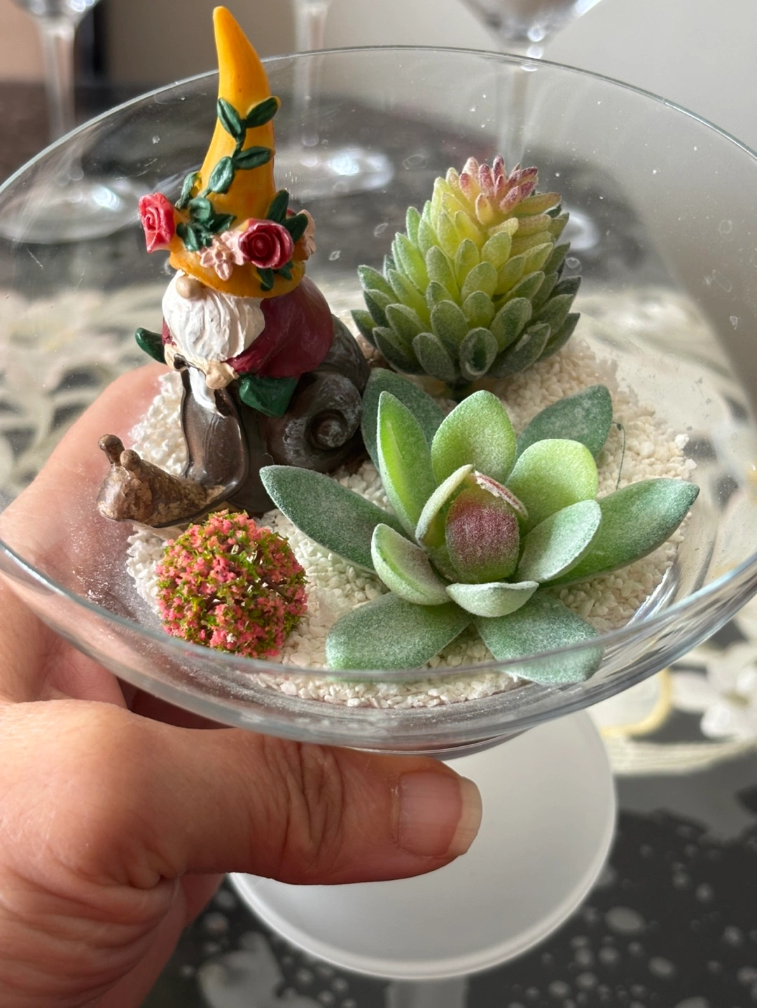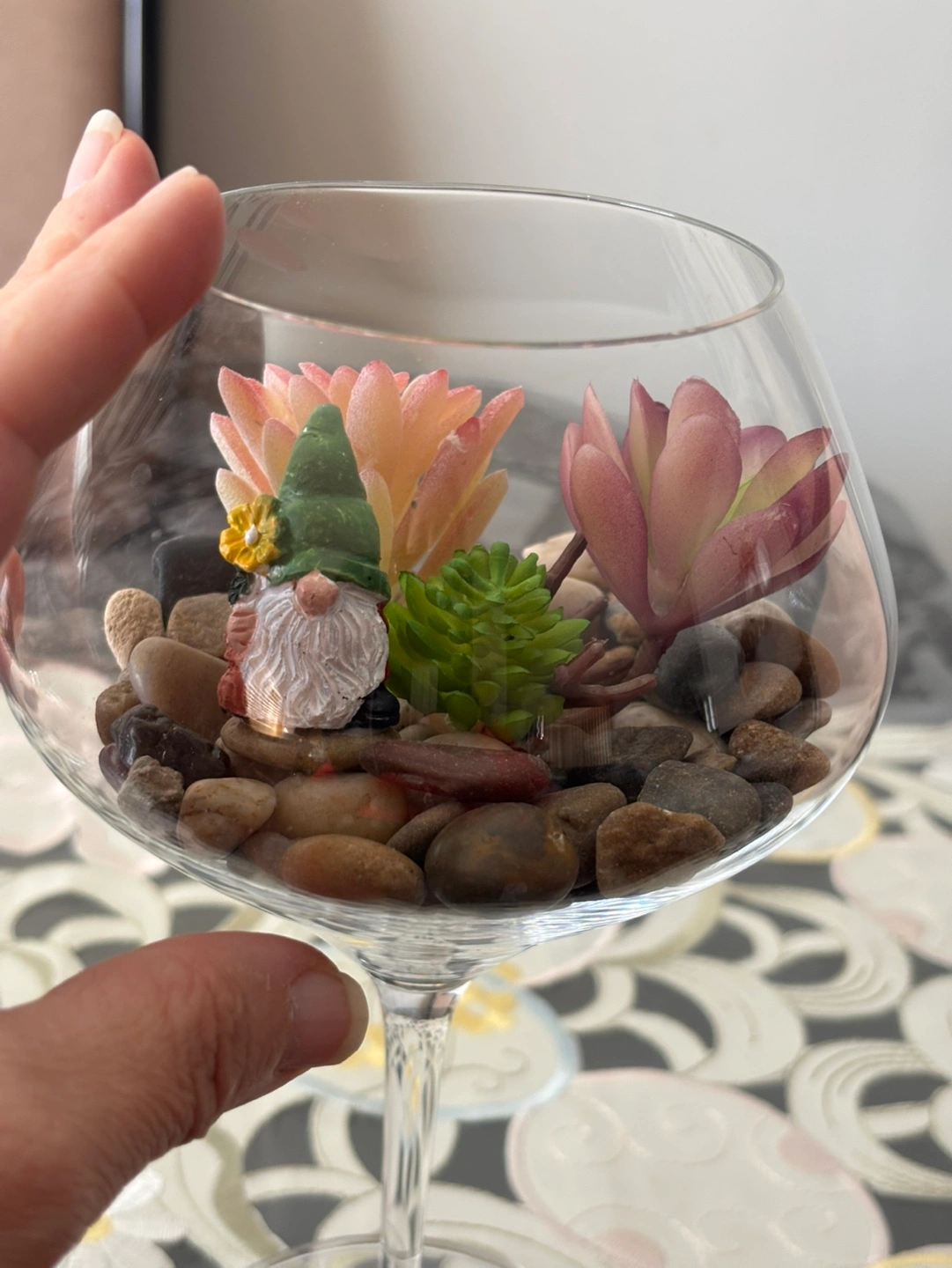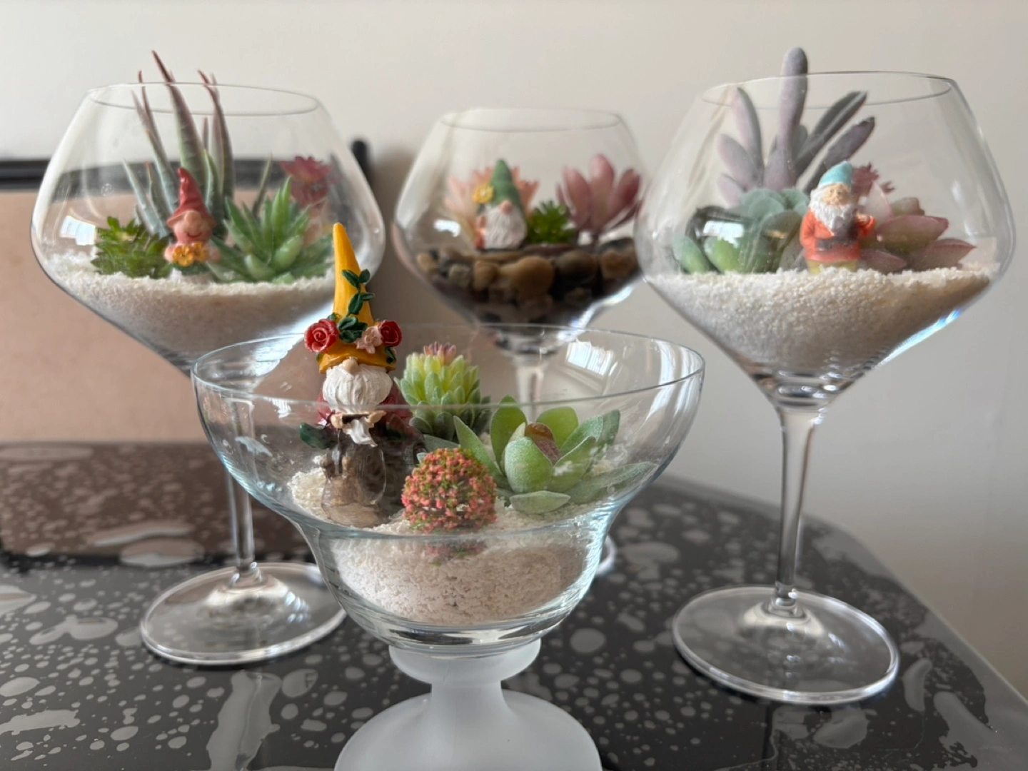 Charming miniature garden features a gnome figurine among artificial succulents. Set in a glass bowl with white sand. Perfect tabletop décor or a gift: I only have the ones in this listing. 3 tall glasses are 8.5” tall and the smaller one is 4.5” tall $25 each or all 4 for $80 No holds, pickup with cash Only Location in Mississauga