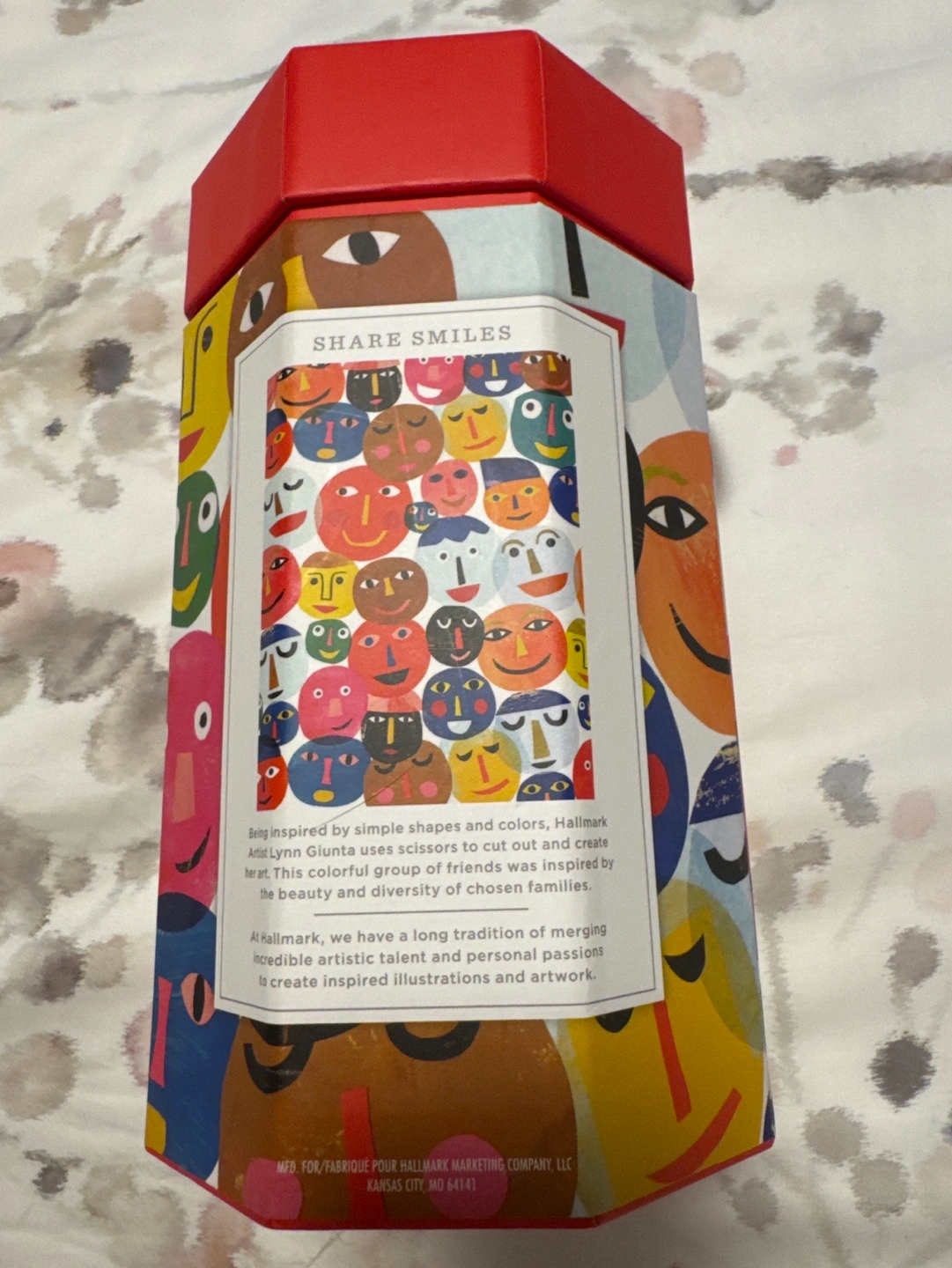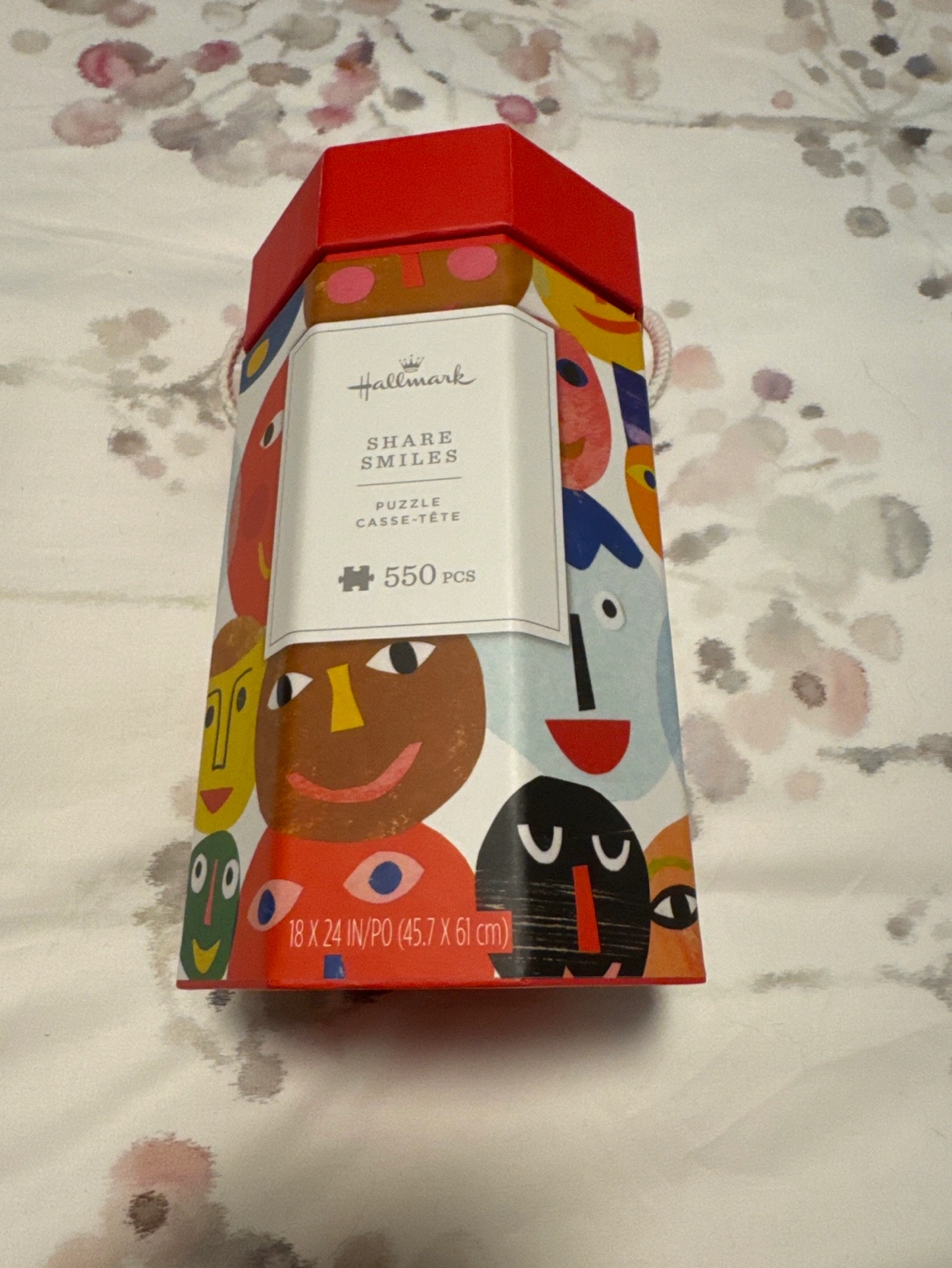 550-piece jigsaw puzzle. Features colourful faces. Comes in a red octagonal tin. 18 x 24 inches. All pieces are there. Puzzle completed once.