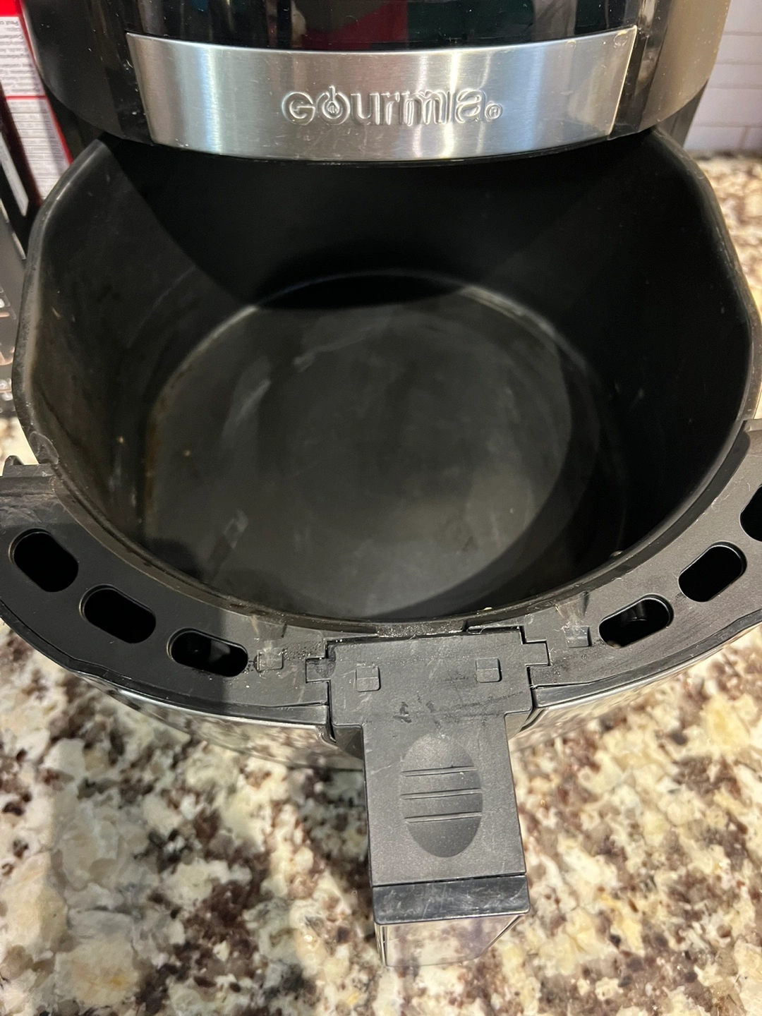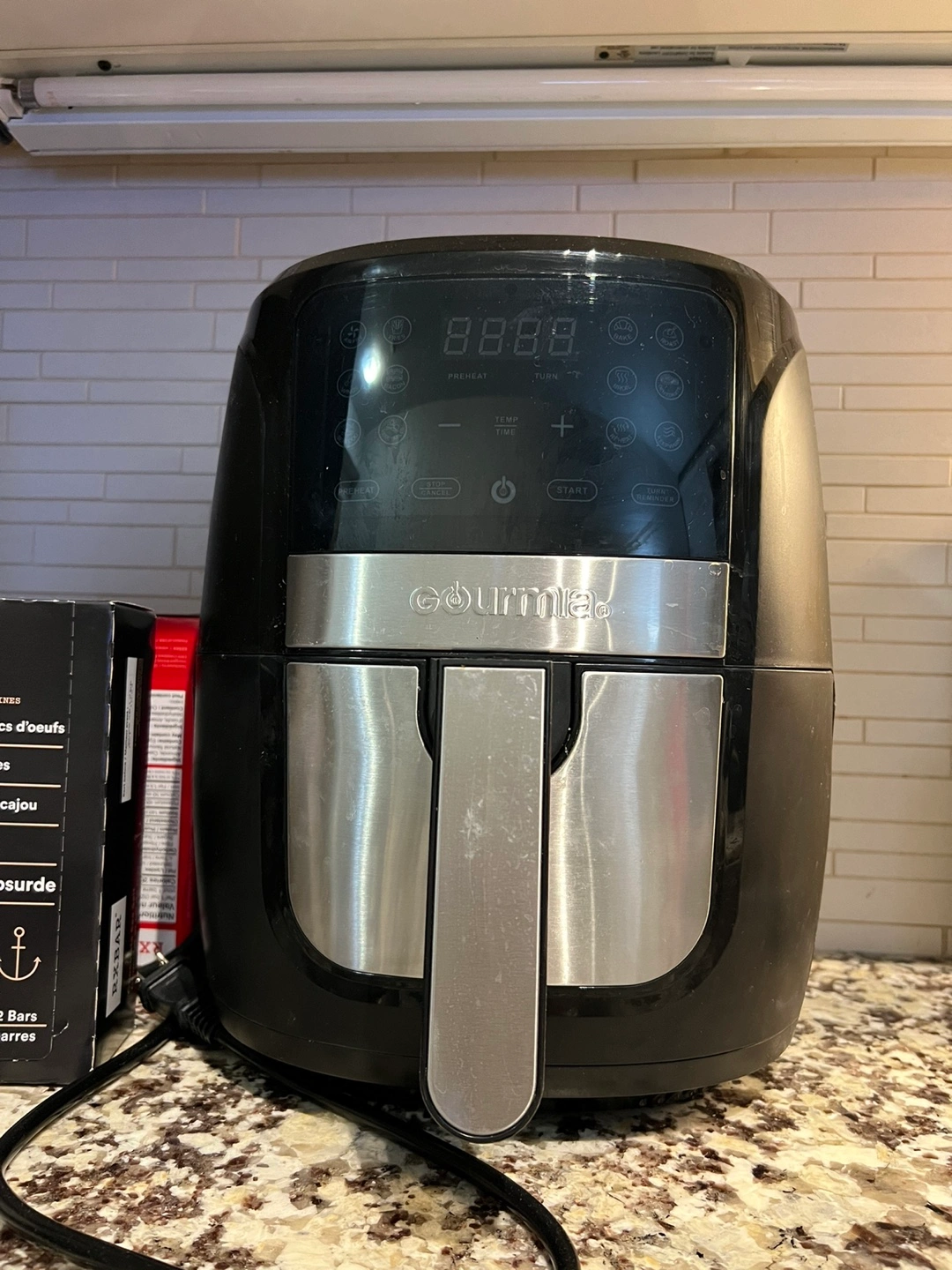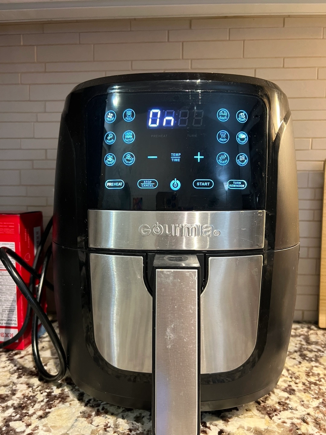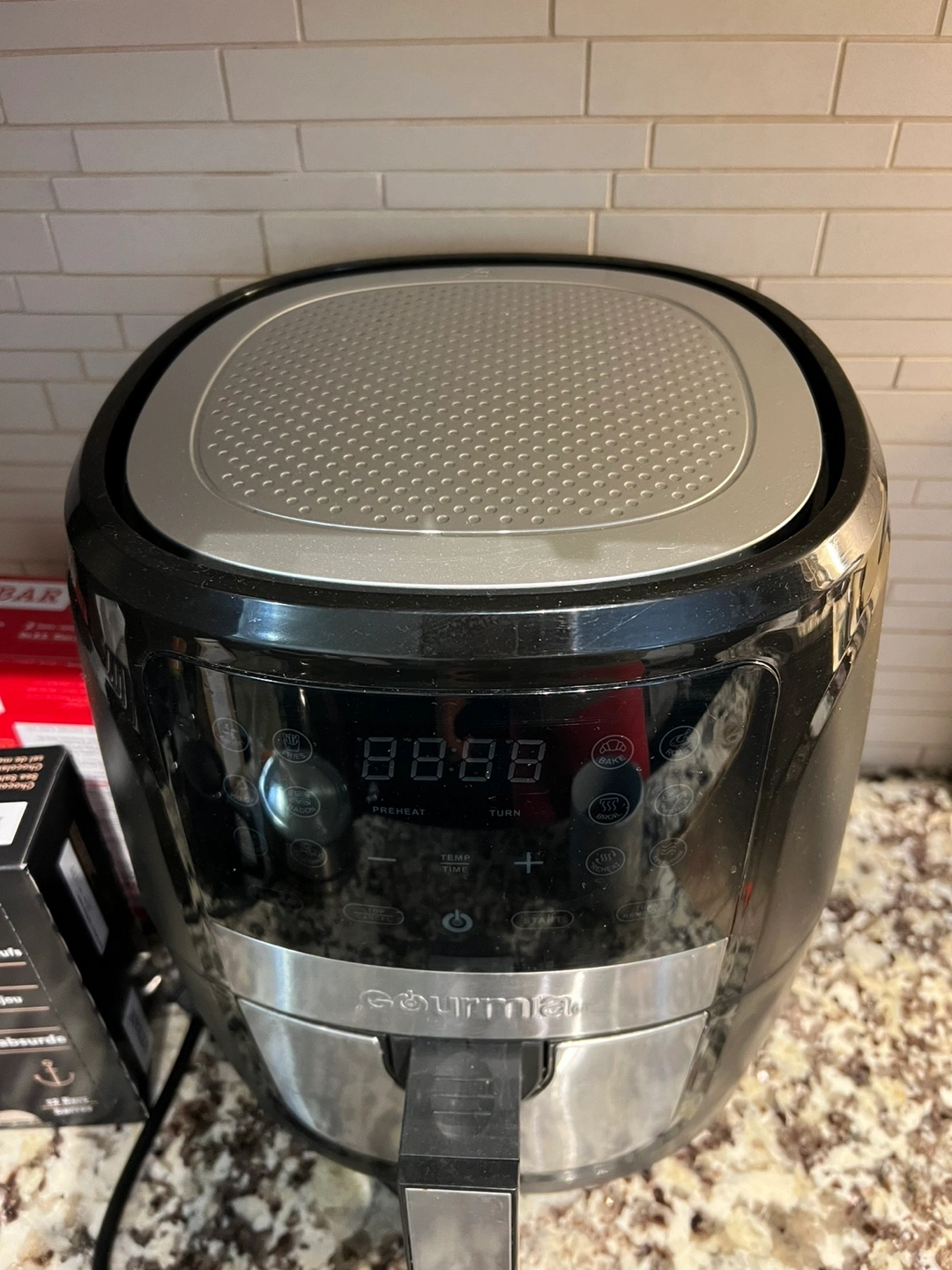 Digital air fryer, black and stainless steel. Large digital display. Multiple functions. Includes basket and power cord.