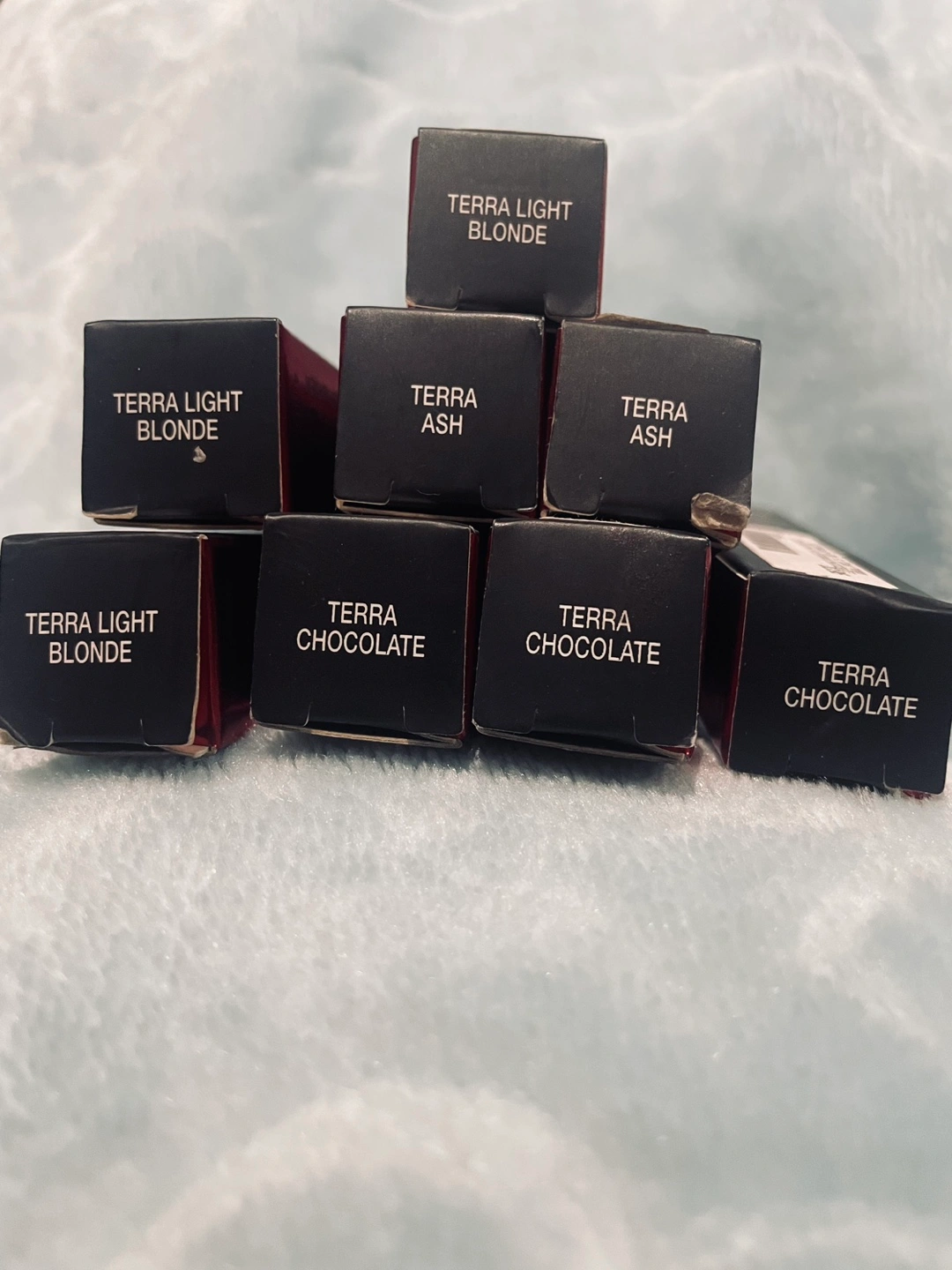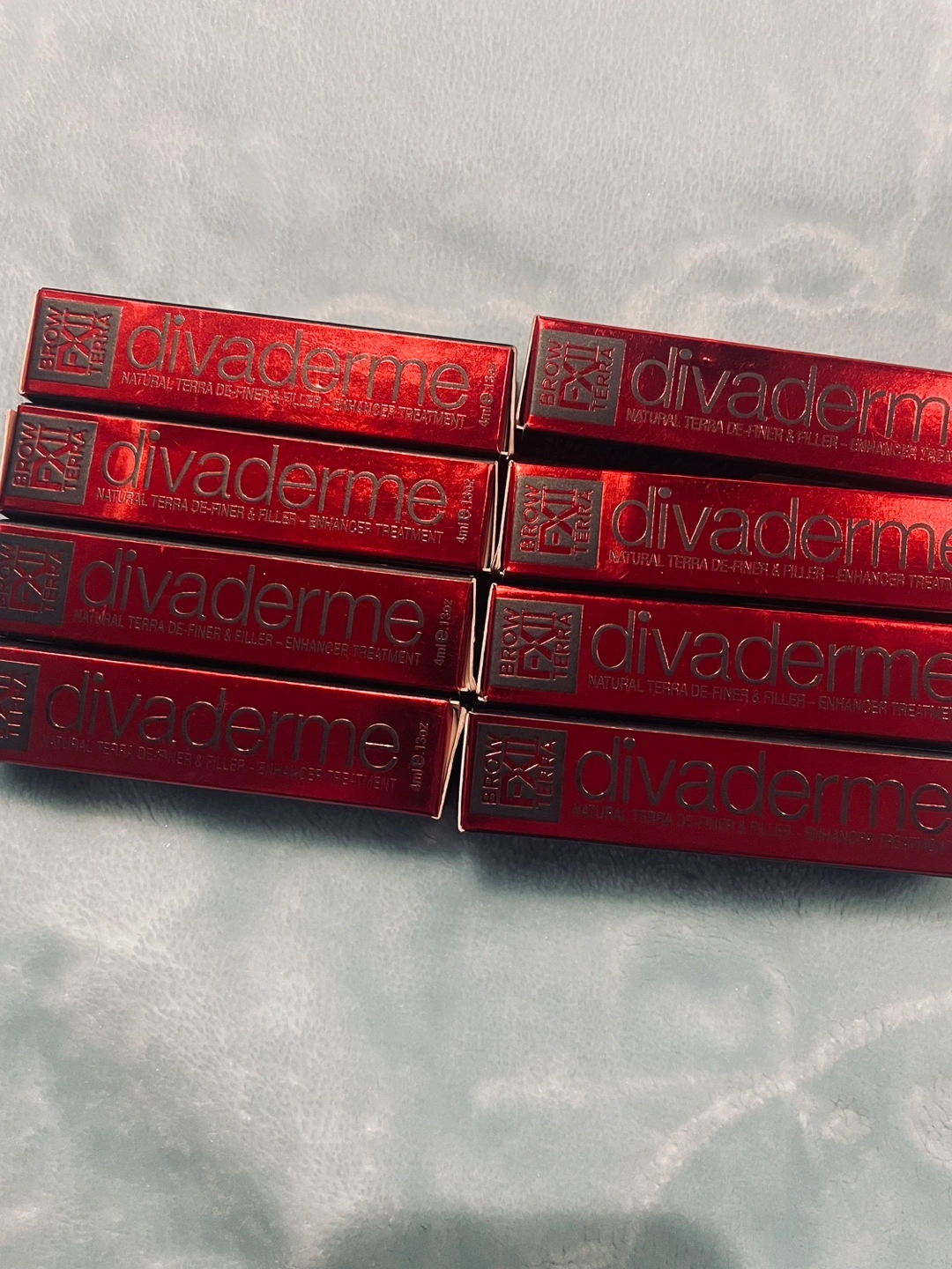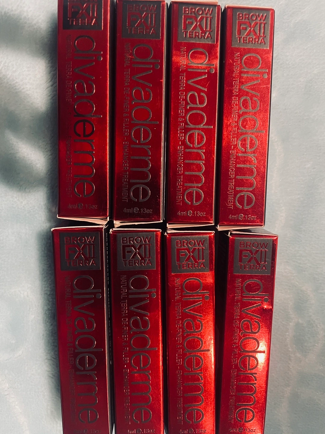Twelve boxes of Divaderme Brow FXII Terra. Shades include Terra Light Blonde, Terra Ash, and Terra Chocolate. New, unopened. Individual retail price $33.95. Asking $15 each