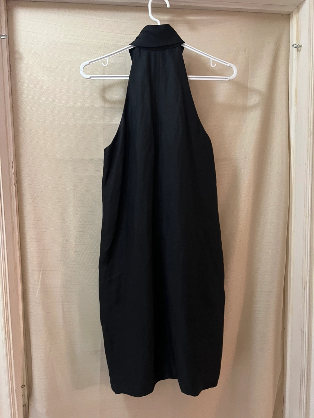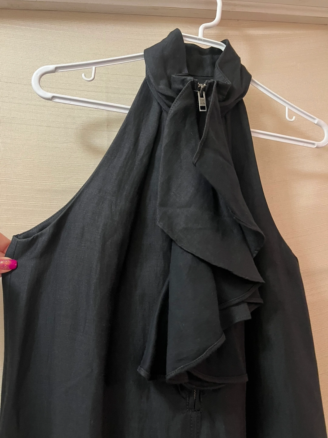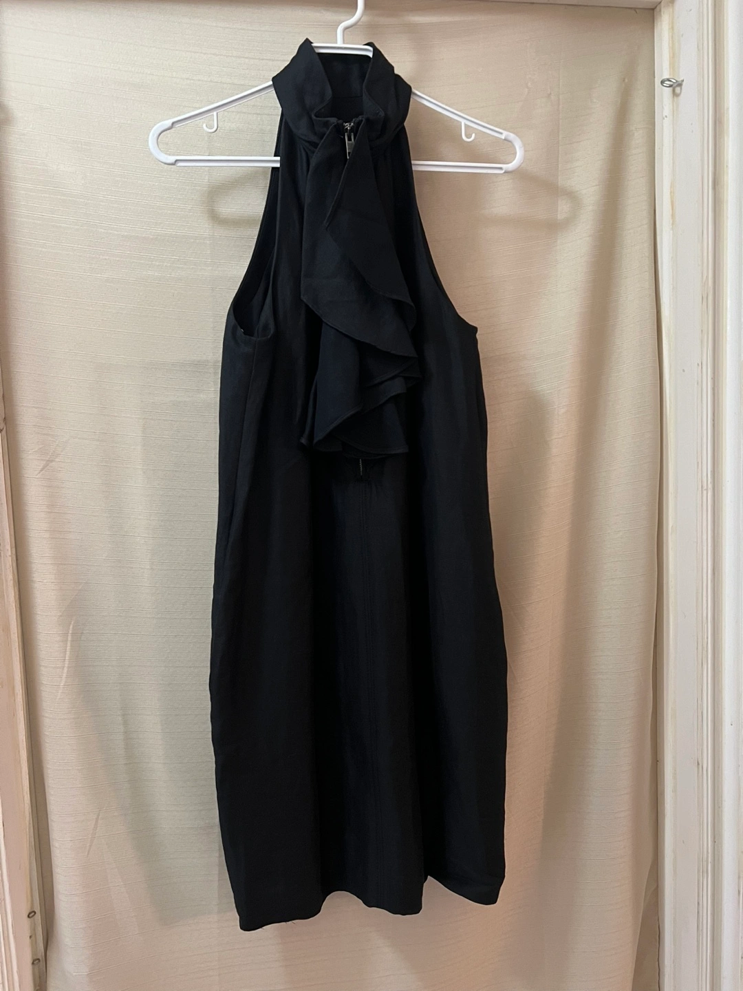 Black sleeveless midi Club Monaco dress. Features a halter neck and a ruffled detail at the neckline with a zipper closure. Size 8. Ptp- 18 Length- 35