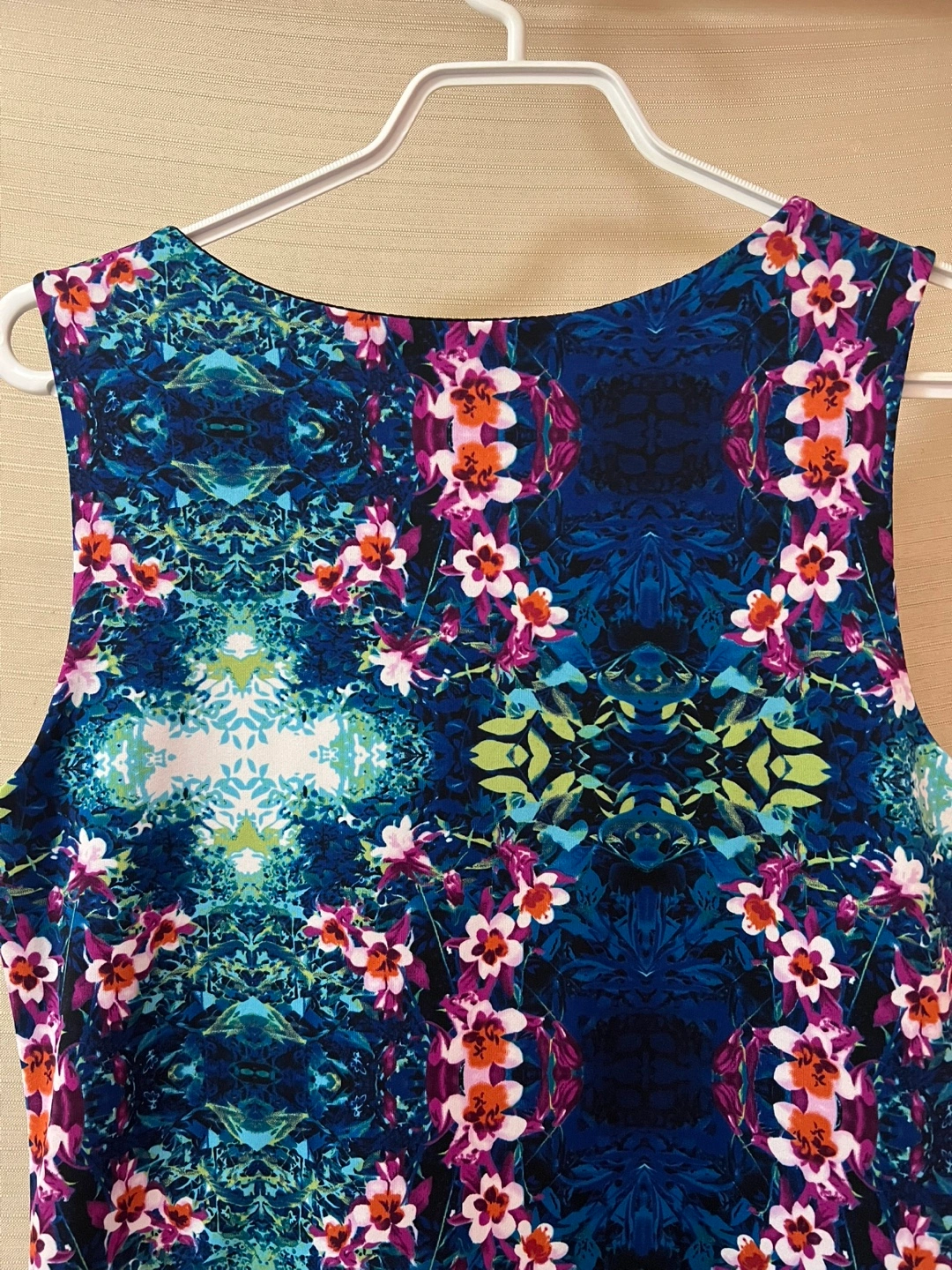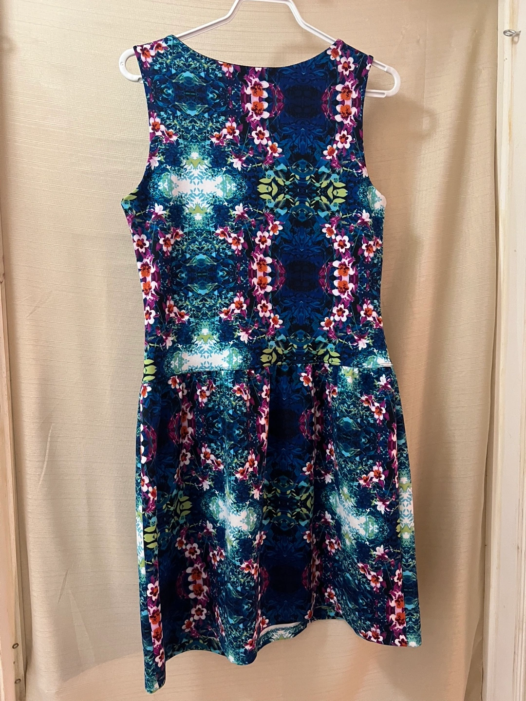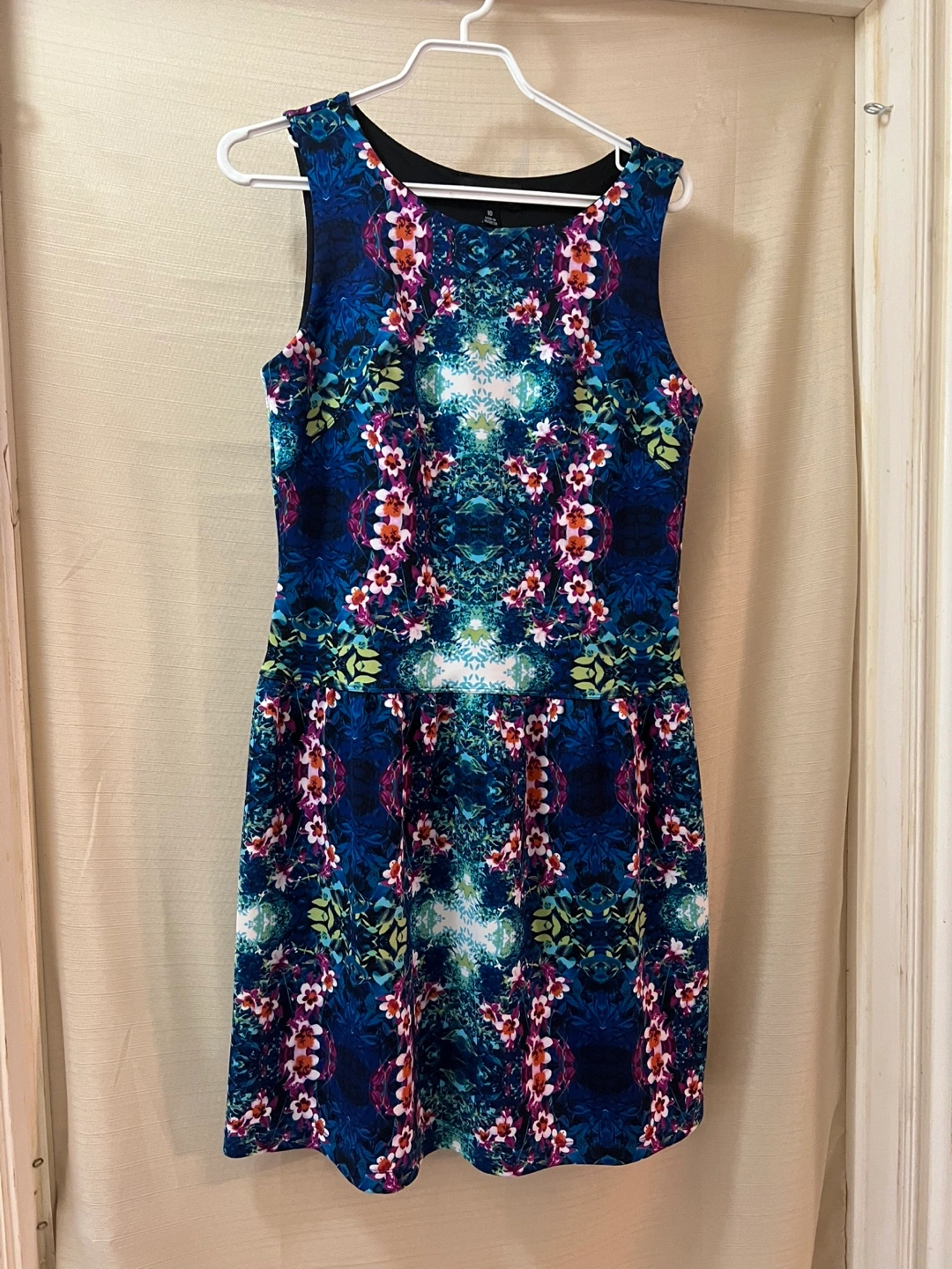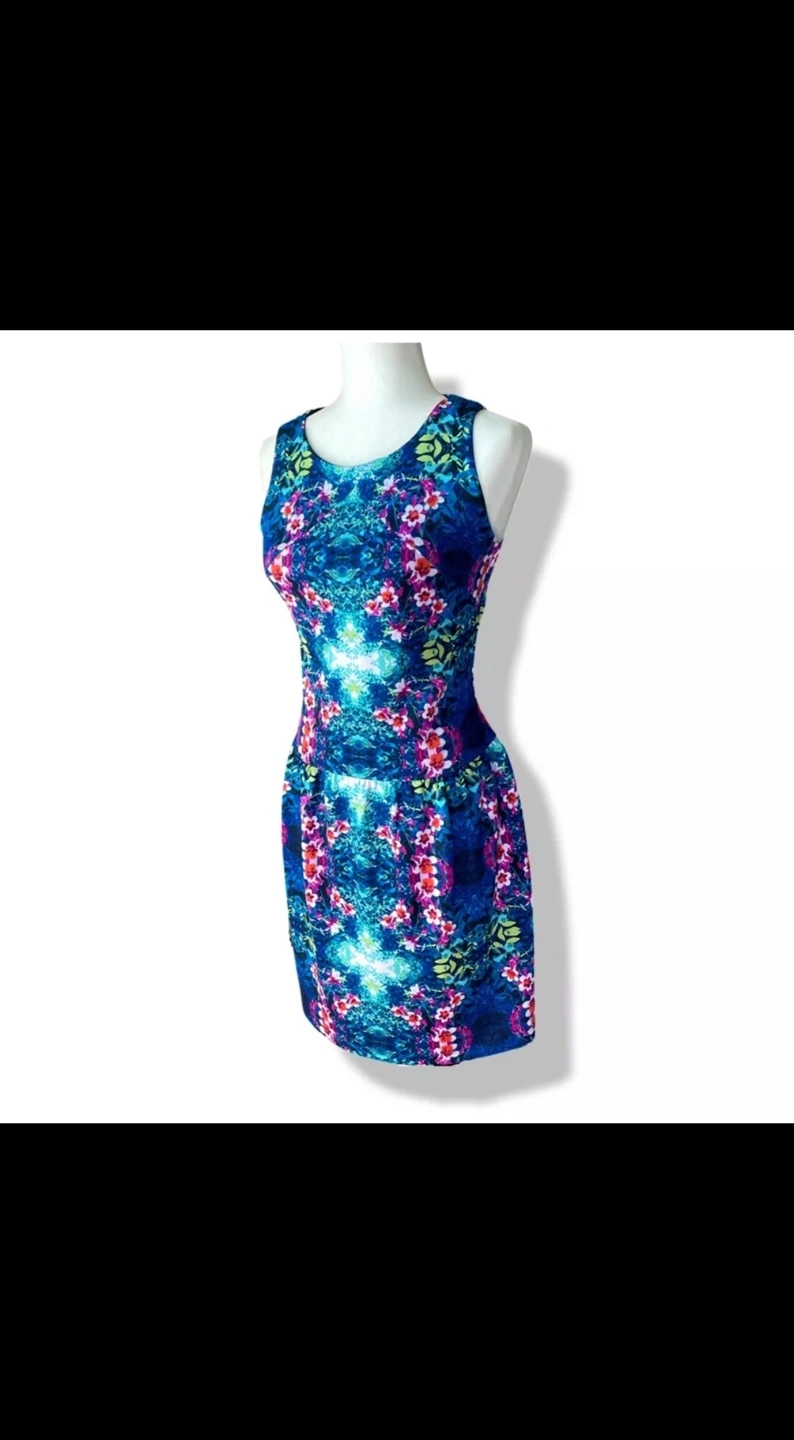 Stunning sleeveless dress. Features a vibrant unique floral print on a dark blue background. Fit and flare flirty silhouette. Size 10. Ptp- 17.5 Waist- 17 Length- 34.5