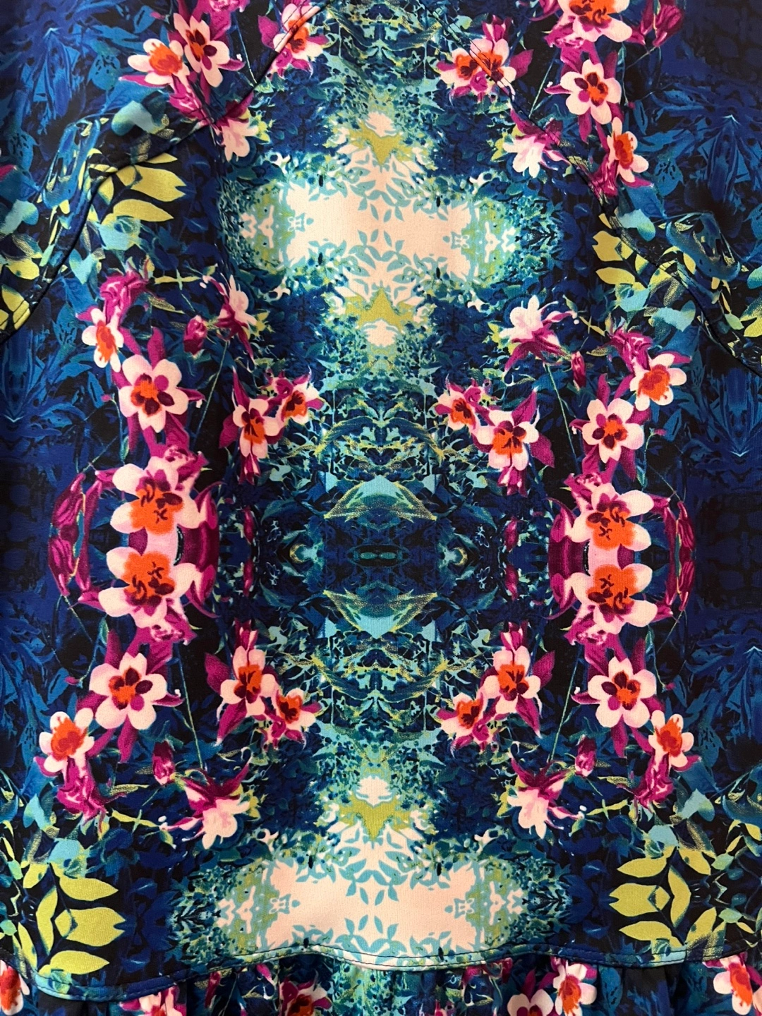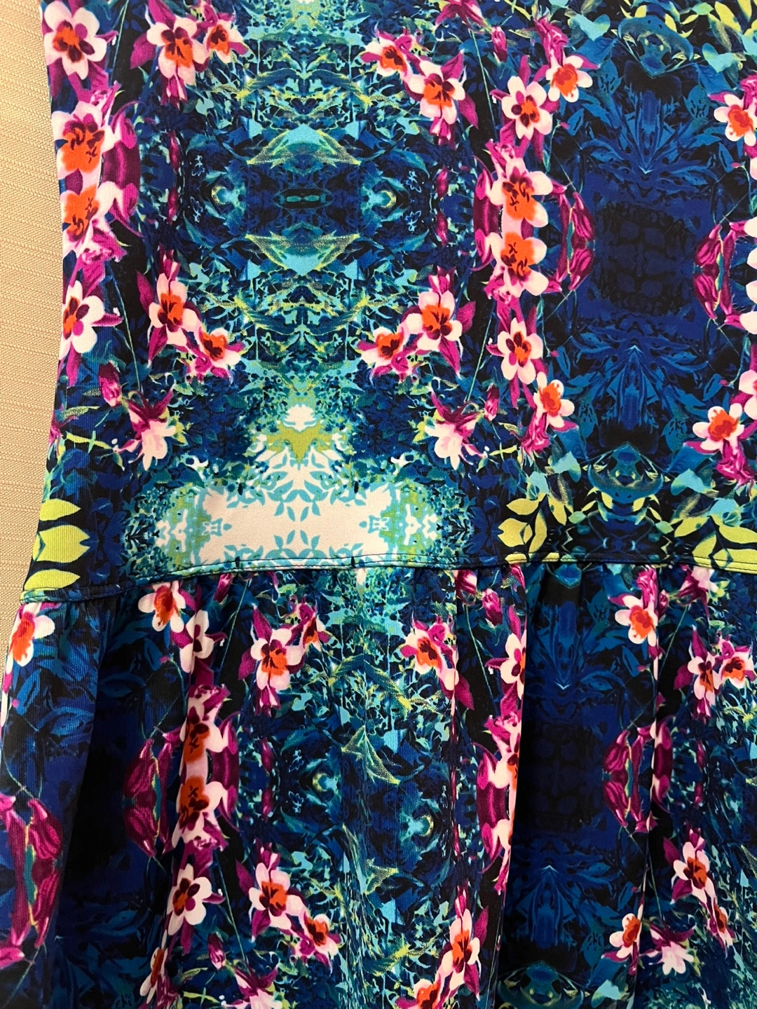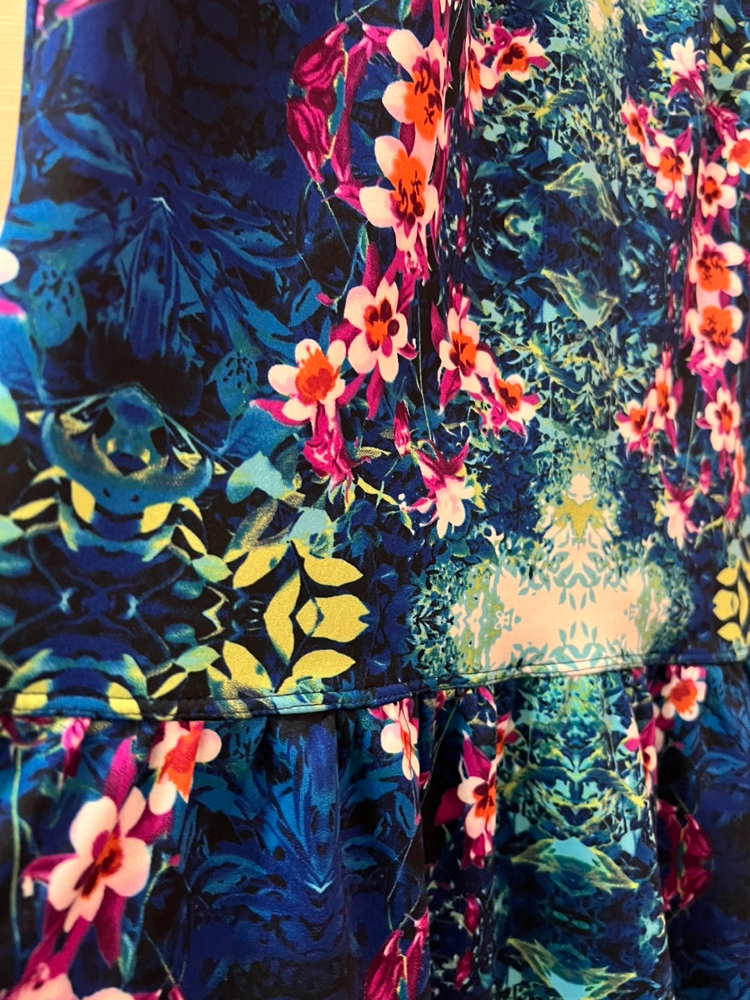 Stunning sleeveless dress. Features a vibrant unique floral print on a dark blue background. Fit and flare flirty silhouette. Size 10. Ptp- 17.5 Waist- 17 Length- 34.5