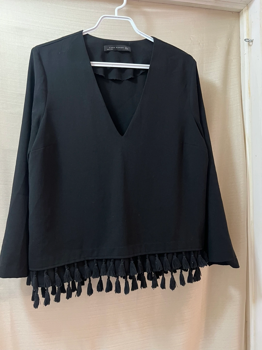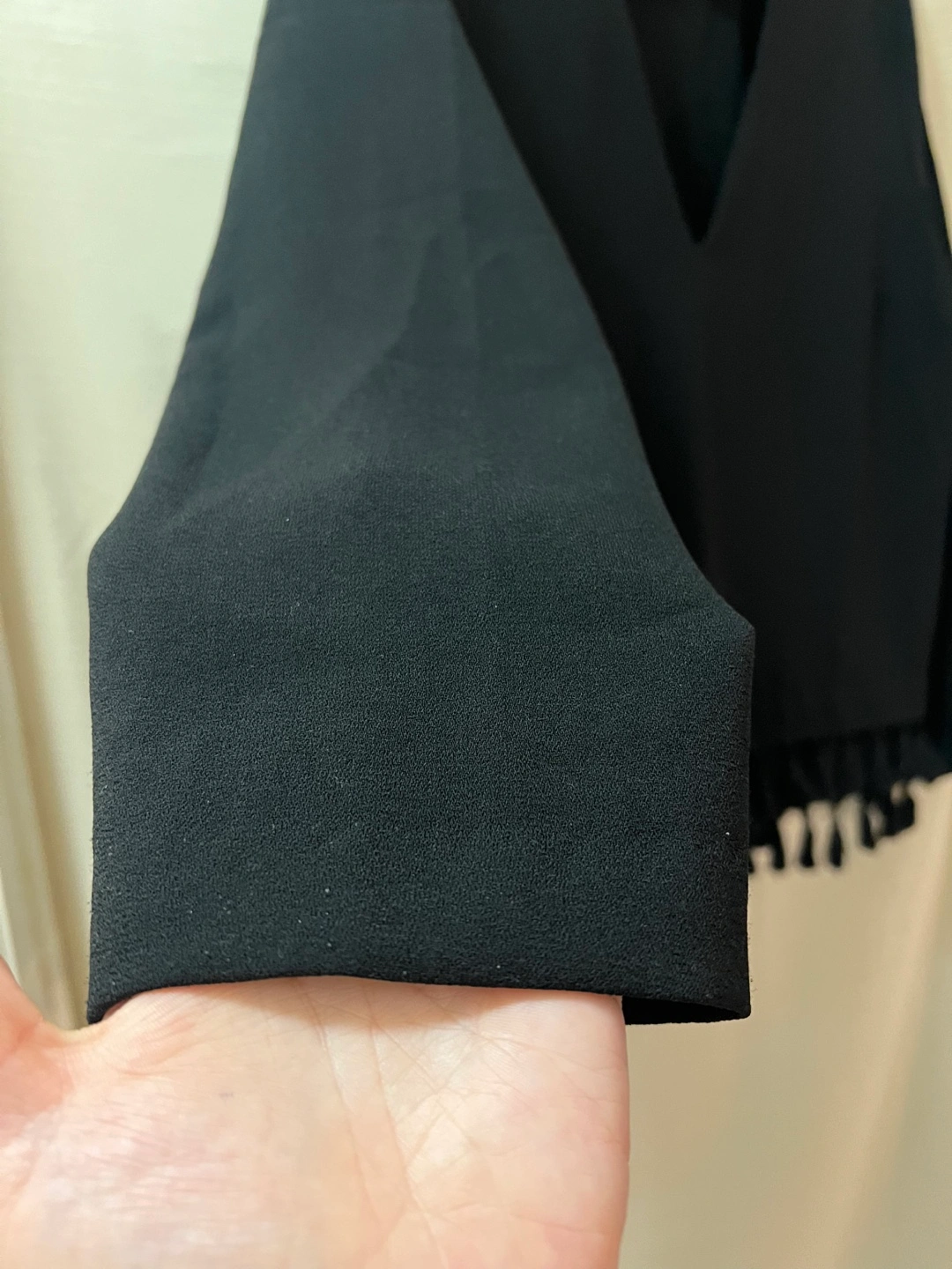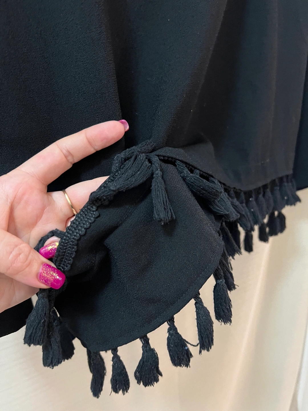 Black cropped top. Three-quarter sleeves. V-neck. Tassel detail at hem. Size Medium. Ptp- 20 Arm- 20.5 Length- 22.5