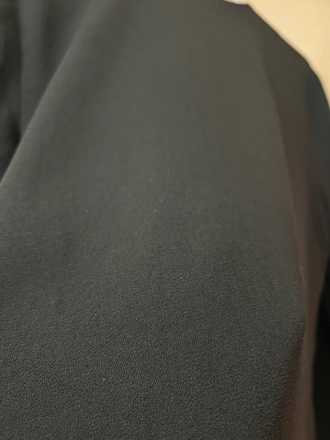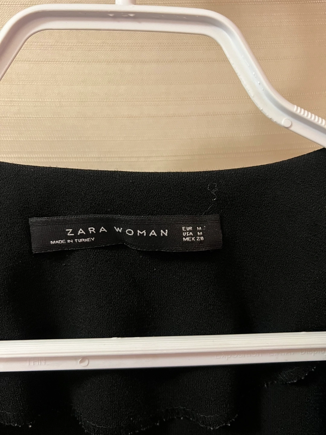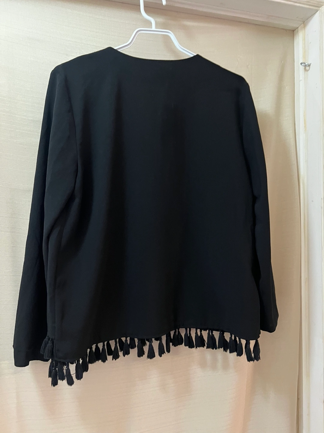 Black cropped top. Three-quarter sleeves. V-neck. Tassel detail at hem. Size Medium. Ptp- 20 Arm- 20.5 Length- 22.5