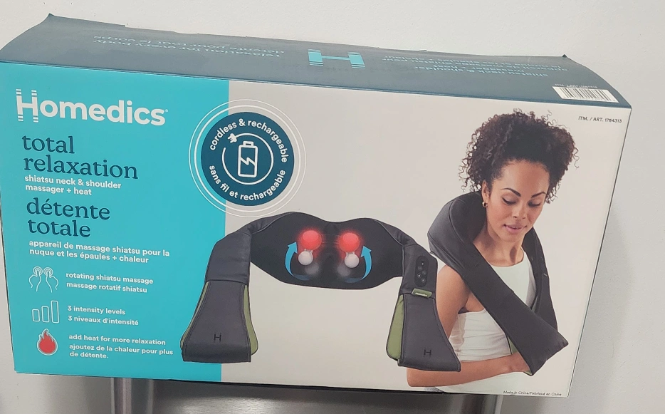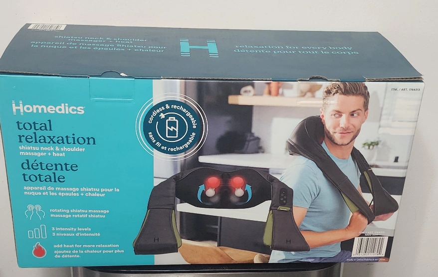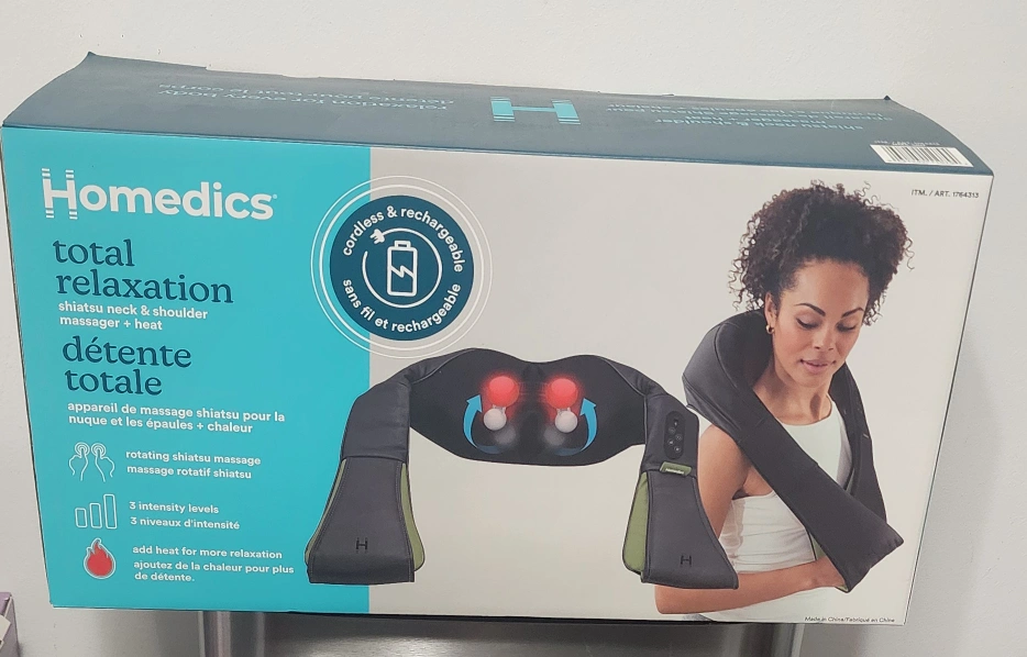 Cordless and rechargeable shiatsu massager. Rotating shiatsu massage. Three intensity levels. Adds heat for more relaxation. Great for neck and shoulders.