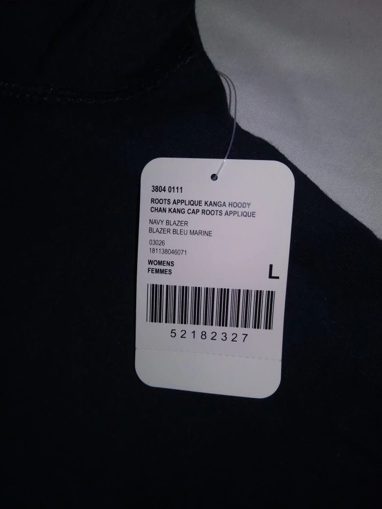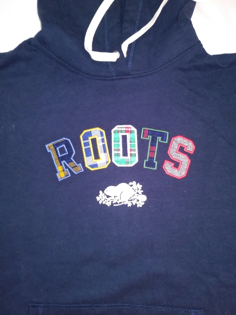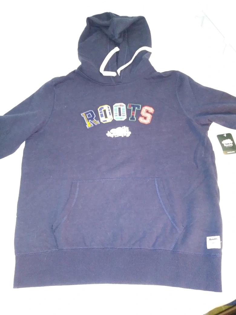 Navy blue women's large Roots hoodie. Features appliqued ROOTS lettering and a Roots beaver logo. Kangaroo pocket. New with tags.