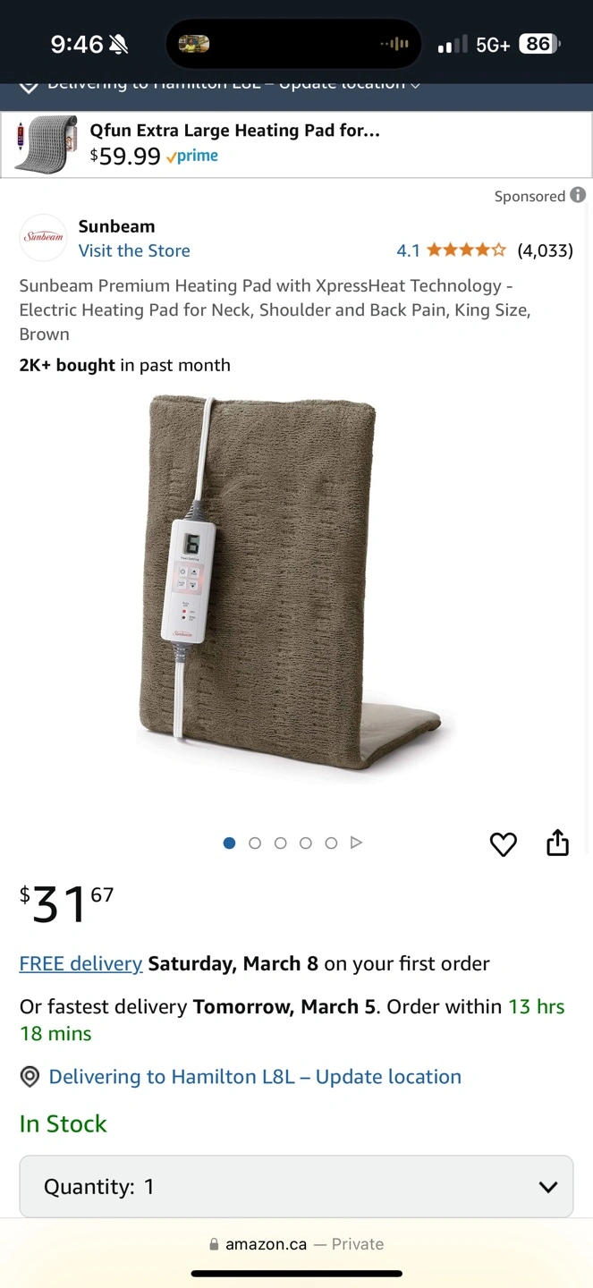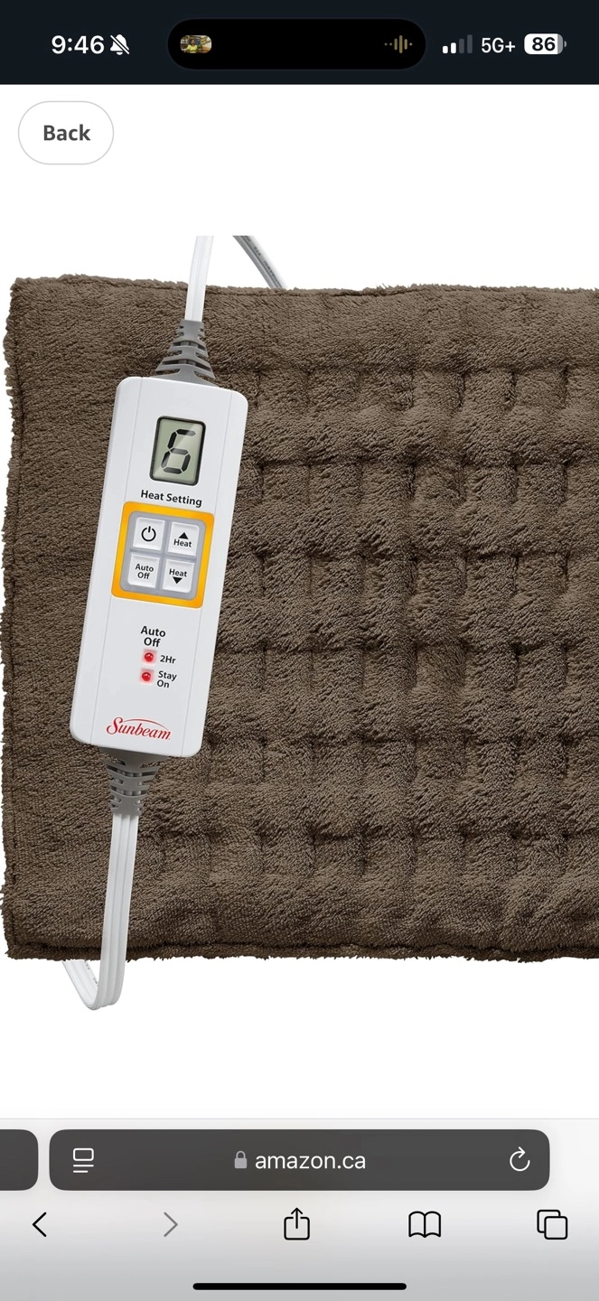 Brown electric heating pad. King size. Features XpressHeat technology. Includes controller with multiple heat settings and auto shut-off.