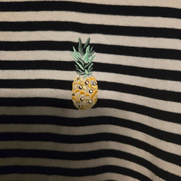 Cute, casual shirt. Black and white horizontal stripes. Embroidered pineapples. Short sleeves. Size M/M. Pick up in south Pickering; view map SEND YOUR MESSAGE WHEN YOU ARE READY TO PURCHASE
