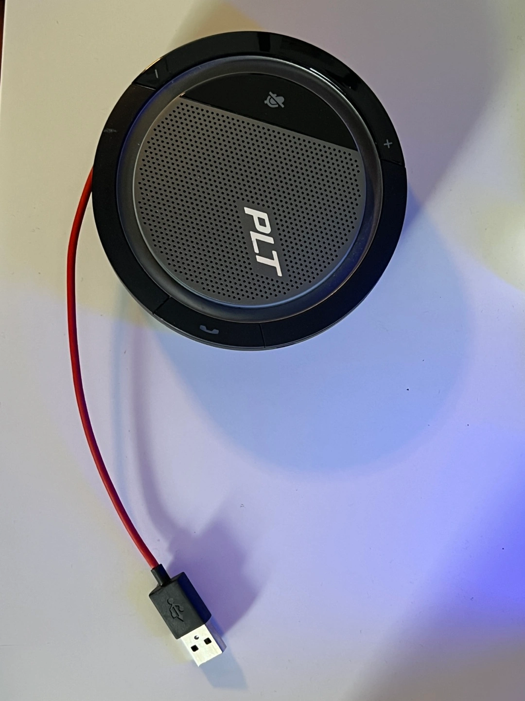Portable USB speakerphone. Includes carrying case. Compact design. Great for conference calls.