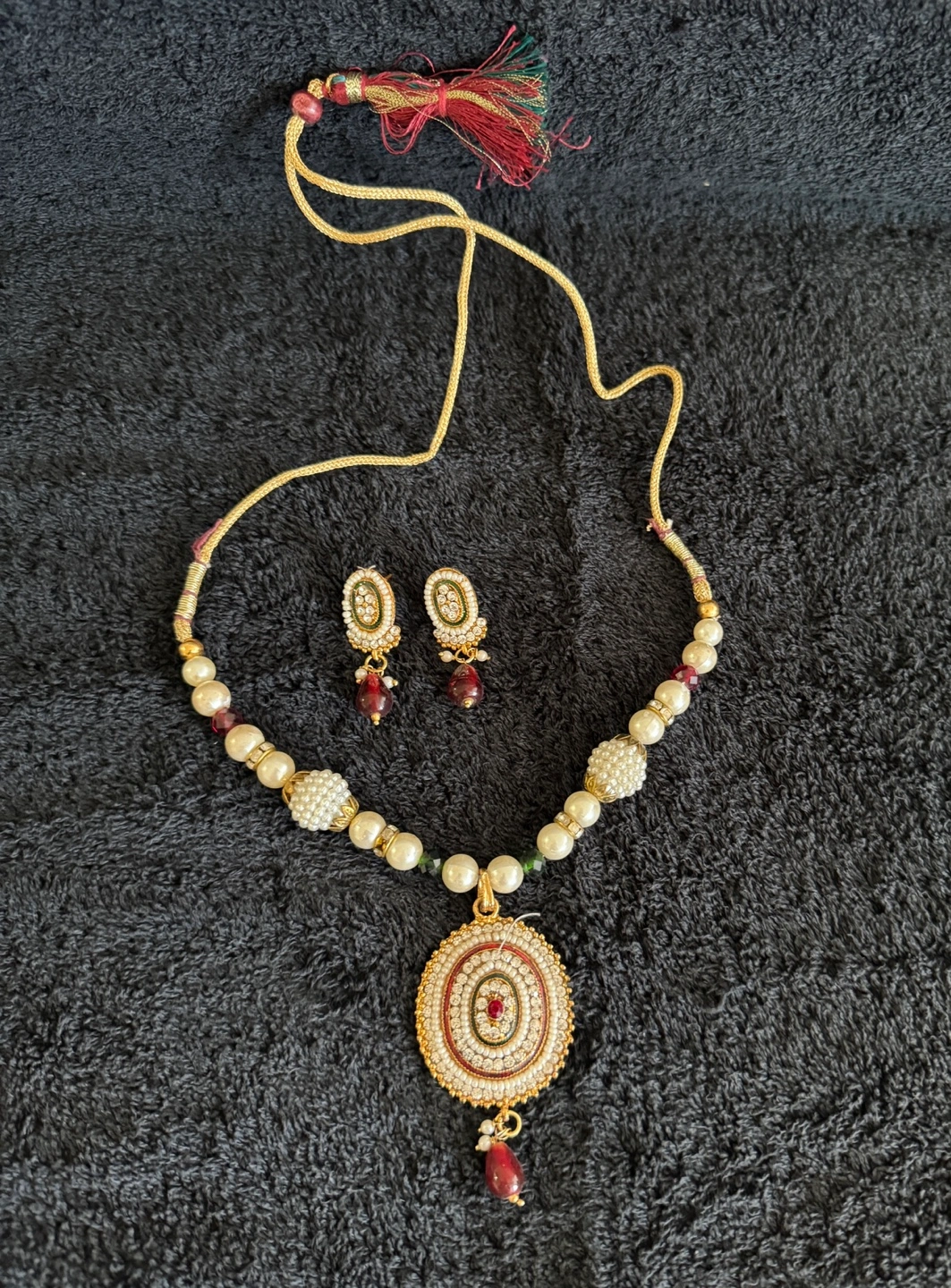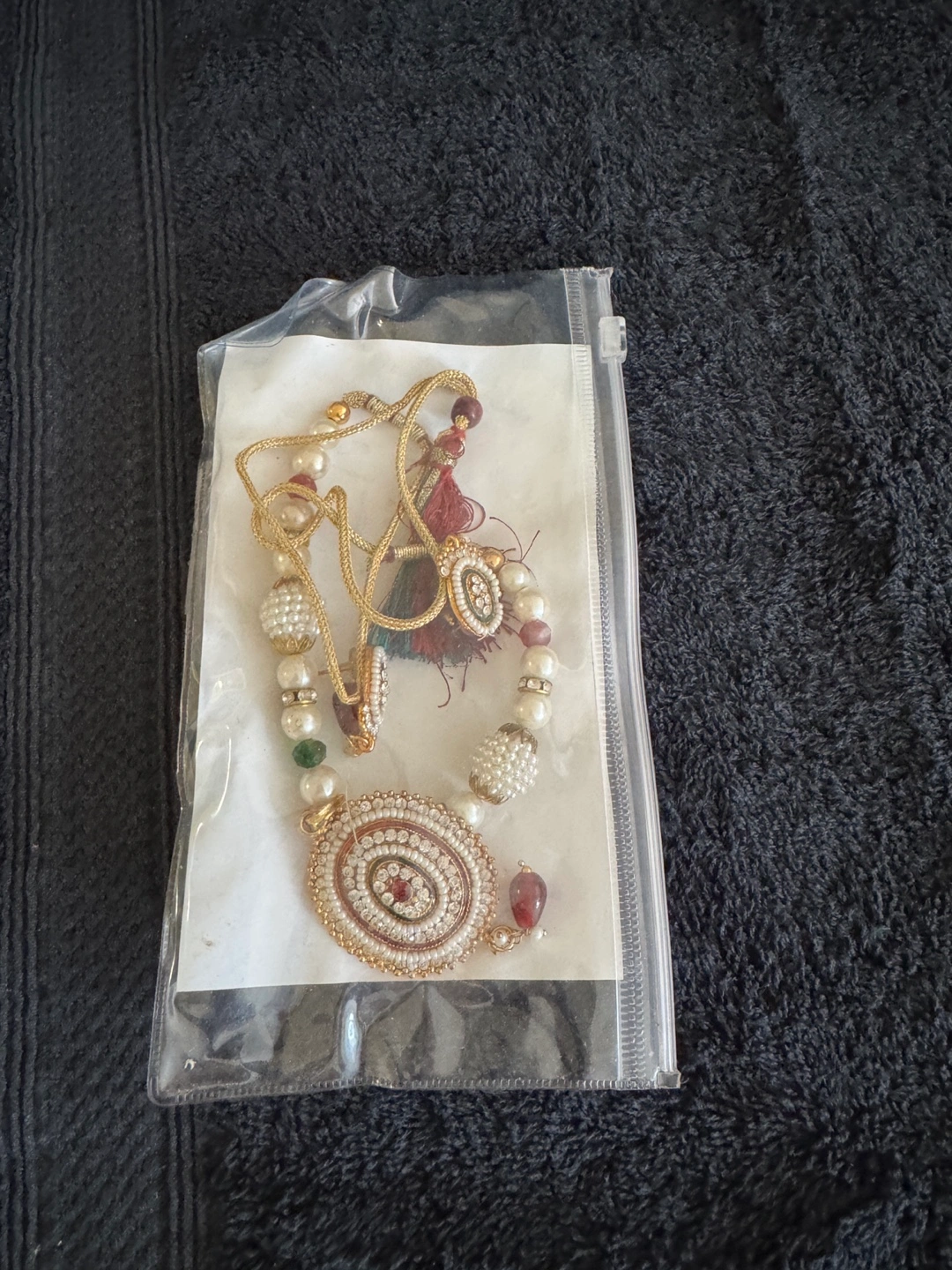 Gorgeous necklace and earring set. Features pearls, stones, and gold accents. Elegant design, perfect for special occasions. Comes in a protective bag.pickup only