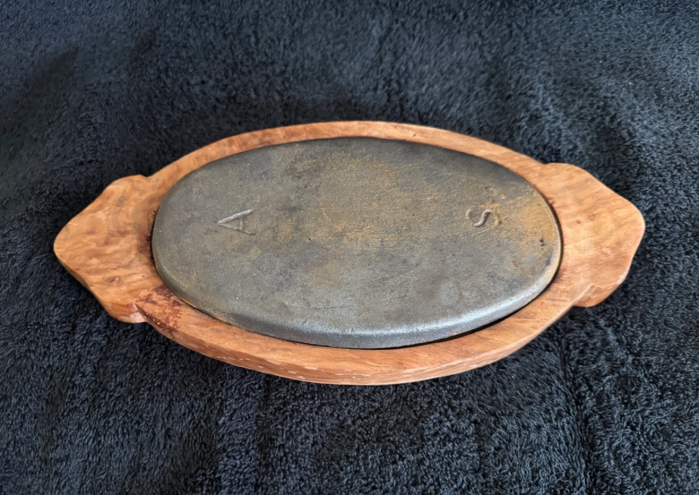 Oval cast iron grilling plate, rustic wooden frame. Perfect for serving sizzling food. Shows signs of use.used once only.wooden frame 33 cm in length.Iron plate 22 cm x13 cm.pickup near dixie and bloor