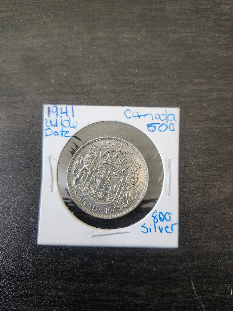 Canadian 50 cent coin. Dated 1941. Silver. Shows the Canadian coat of arms.
