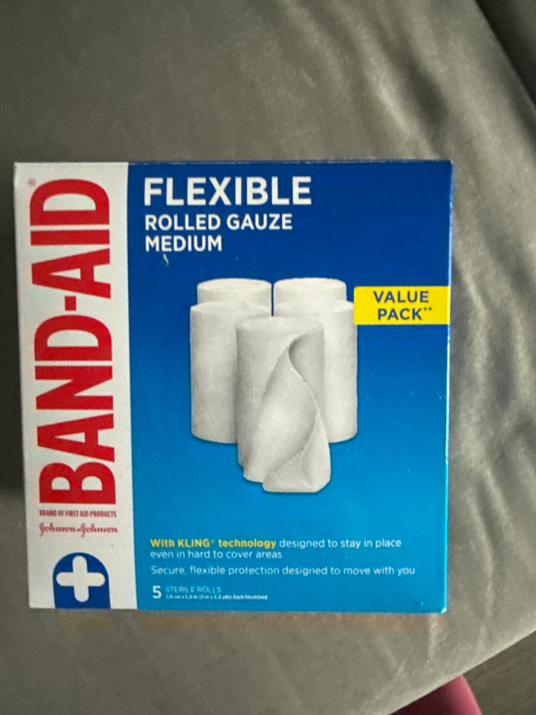 Five sterile rolls of medium rolled gauze. Kling technology. Designed to stay in place, even in hard-to-cover areas. Secure, flexible protection.