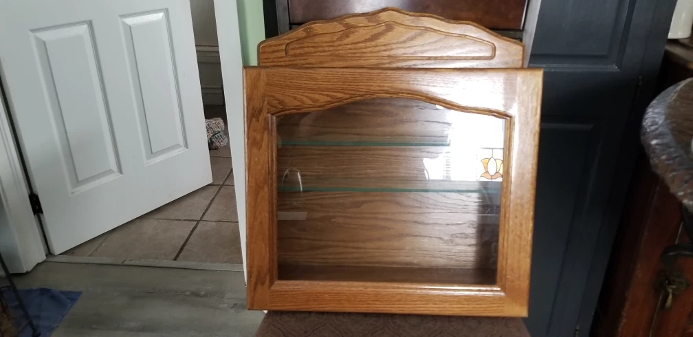 Solid Oak Wall Hanging Display Cabinet with 2 glass shelves. 18" Width 5"Depth 22" Height In mint condition used to display your nic- nacs.