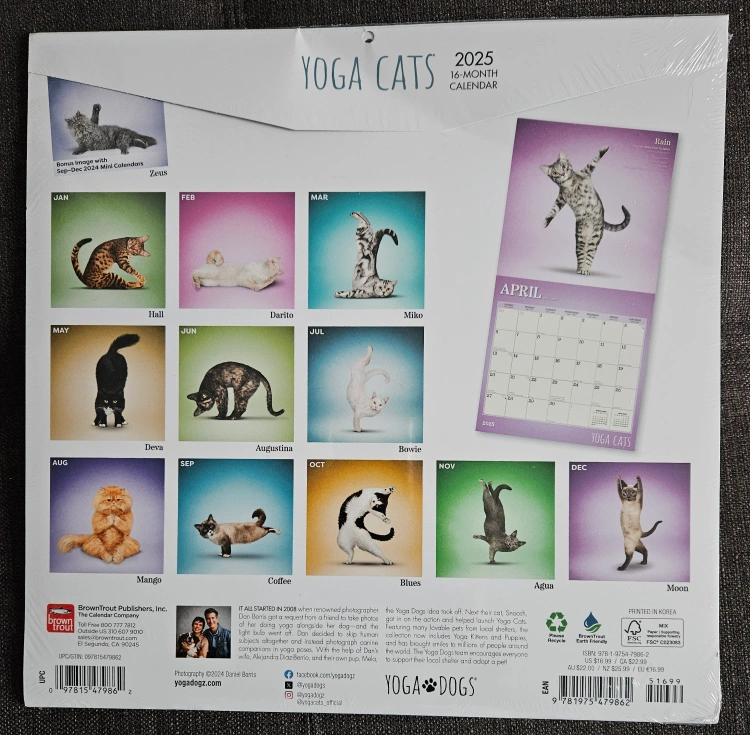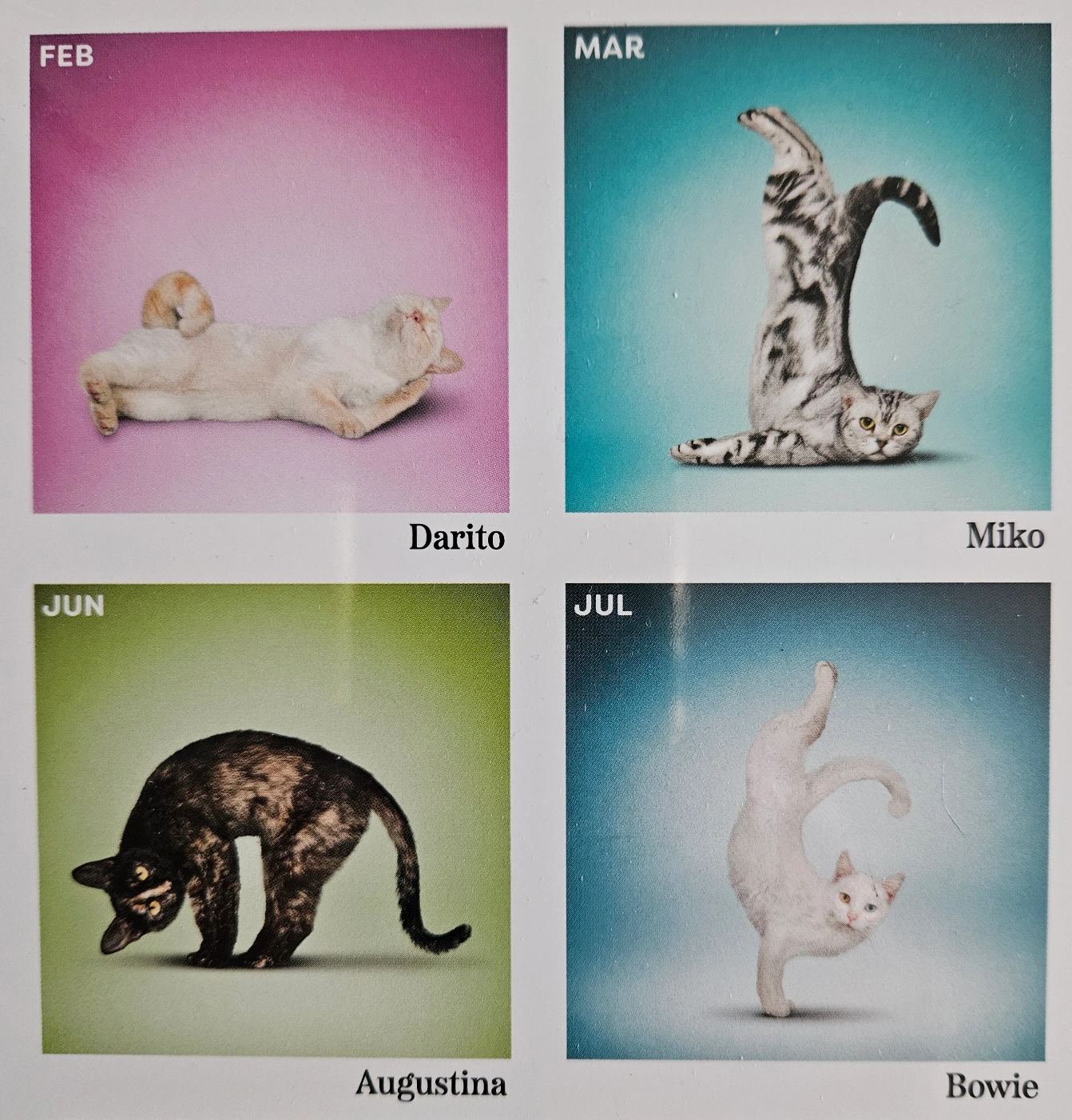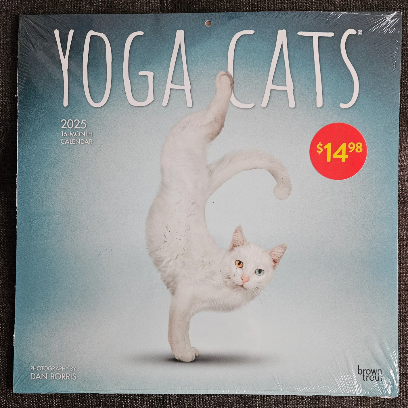 2025 16-month calendar sealed. It features photographs of cats in yoga poses. Includes a grid for each month. Pickup near King St W and Dufferin St. See my other listings.