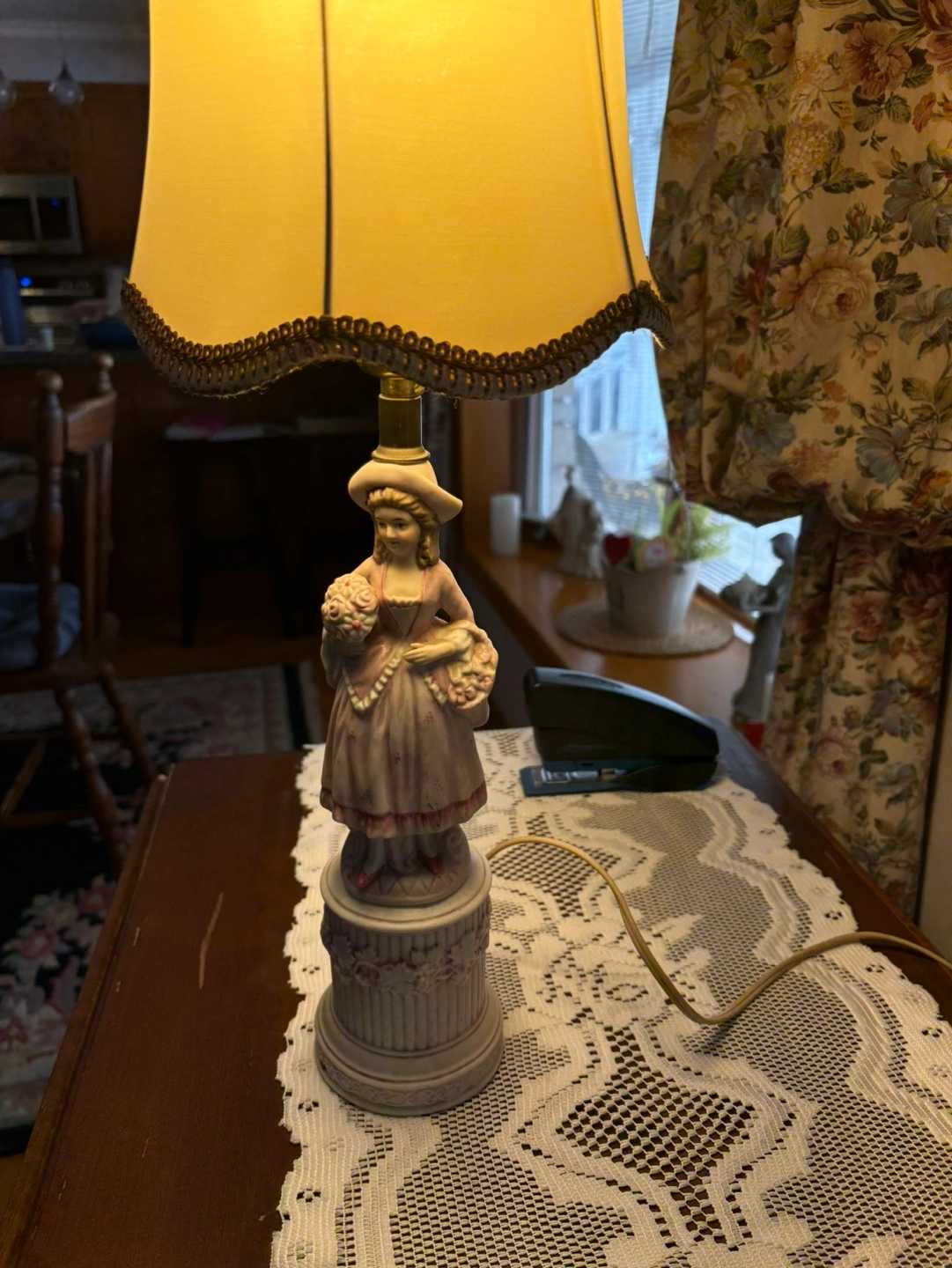 Charming vintage table lamp. Features a porcelain figurine of a girl. Cream-coloured fabric shade. Electrical cord included. Shows some wear.