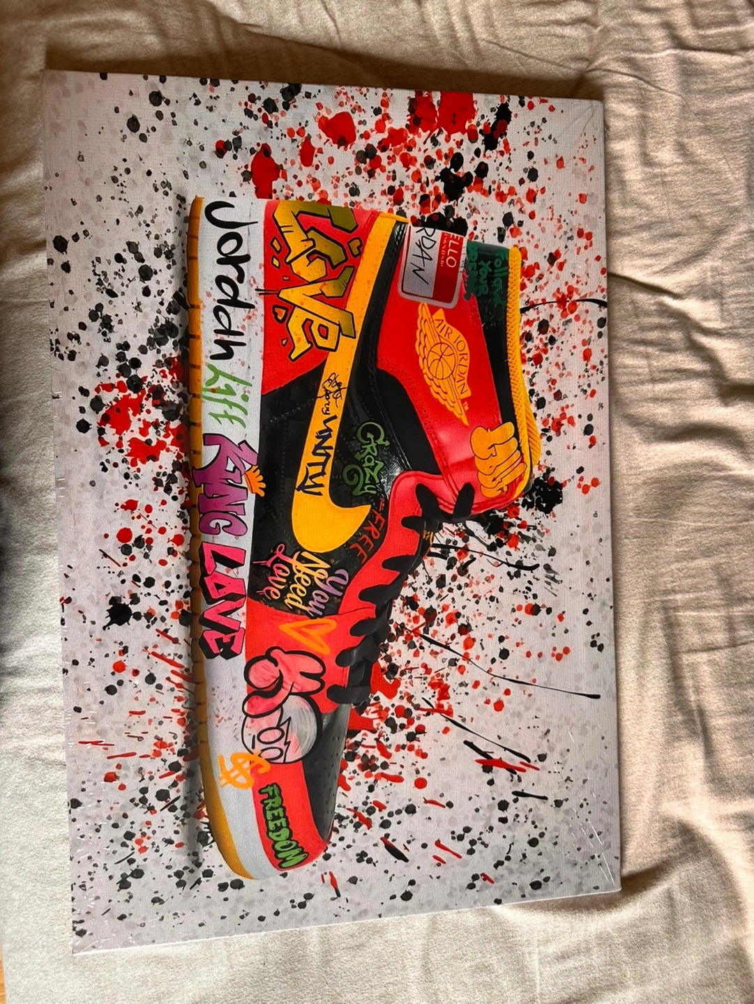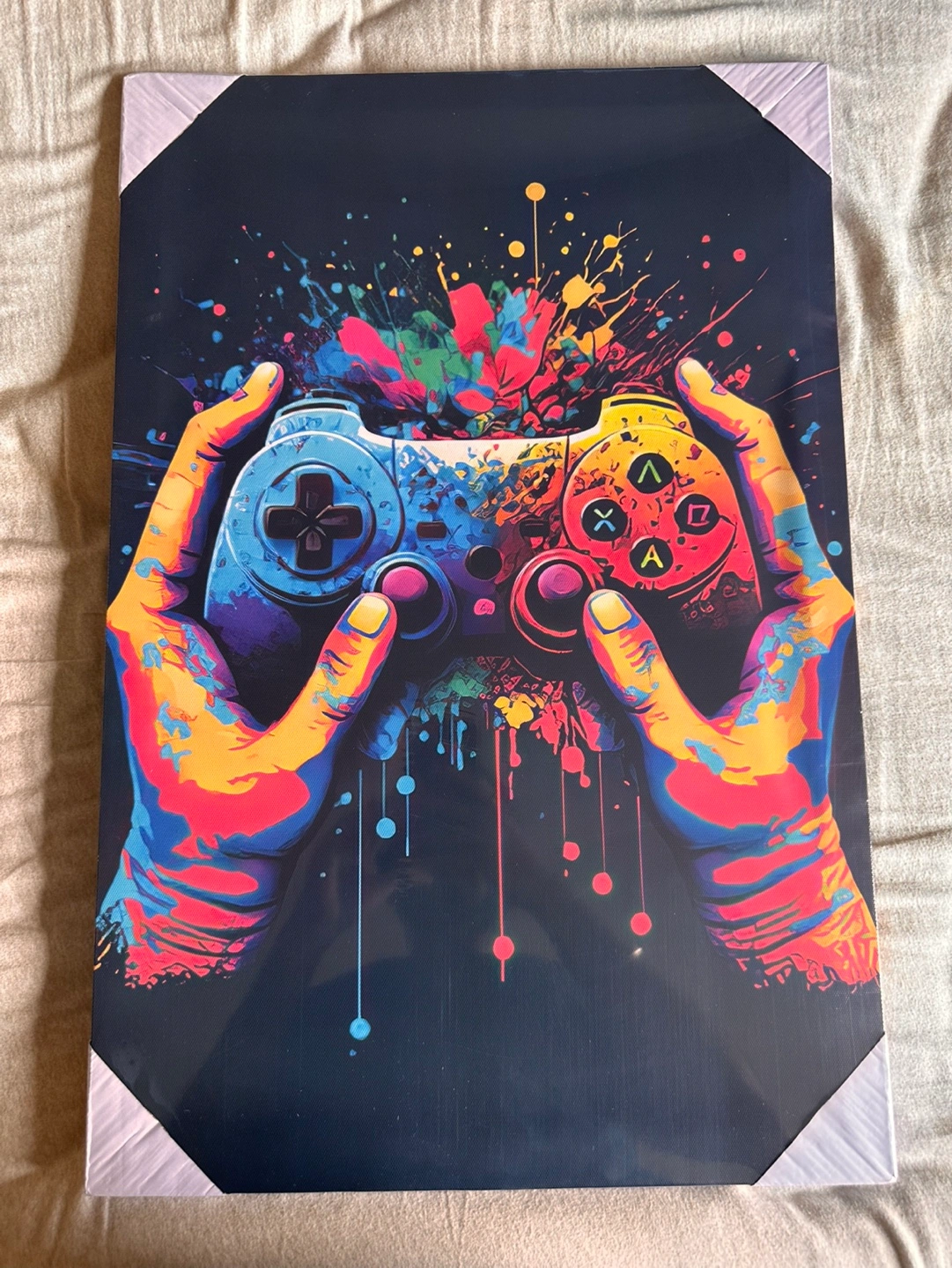 Two canvas prints. One features a vibrant design of Air Jordan sneakers with graffiti art. The other depicts colourful hands holding a video game controller with a splash paint effect. Great for gamers or sneakerheads.