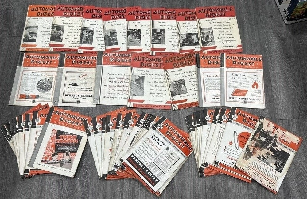 45+ Vintage Automobile Digest Magazines 1930s E-Transfers Accepted Pick Up Anytime Lot of 45+ issues of Automobile Digest car magazines from the early 1930s. These publications were trade and service field magazines with highly detailed period articles on automotive servicing, piston technology, wiring diagrams, repair methods, and advertisements from the era. Perfect for collectors of vintage automotive literature, restoration enthusiasts, or display. Condition: Mixed vintage condition with expected age wear, some issues better than others. Overall a rare large group from the Depression-era automotive industry. automobile digest, vintage car magazines, 1930s automotive, classic car literature, piston rings, service manuals, mopar history, antique auto collectibles, restoration reference