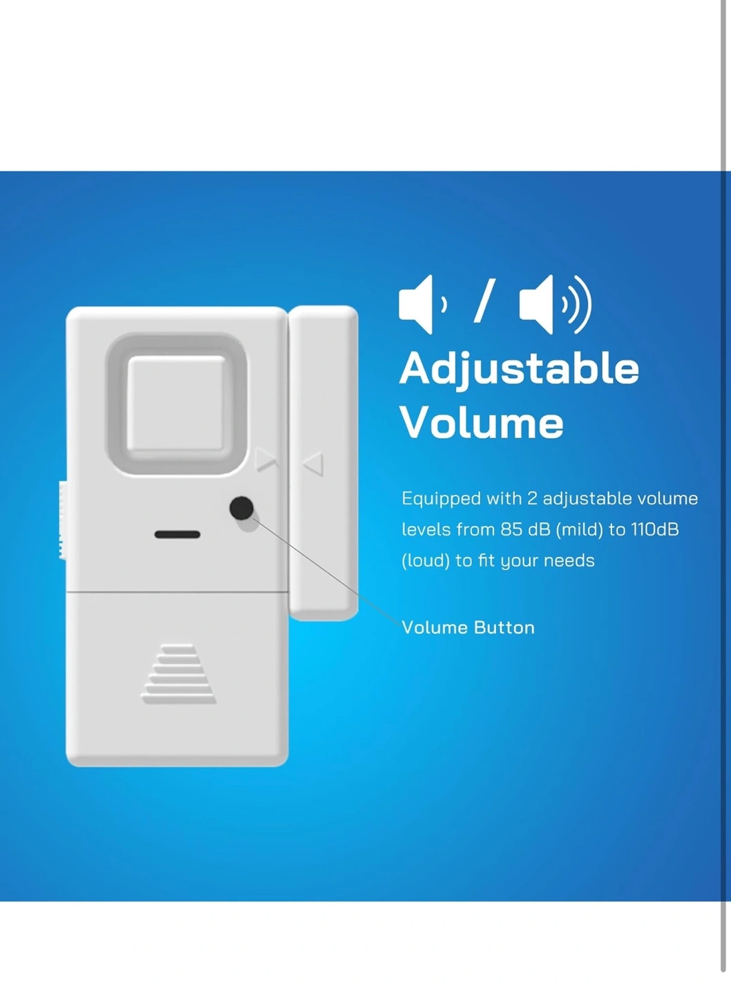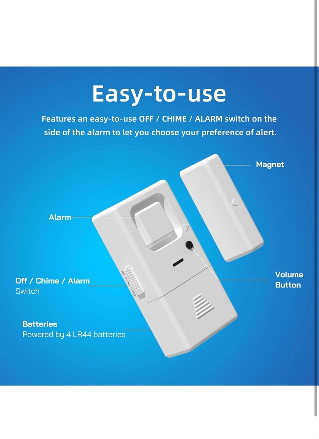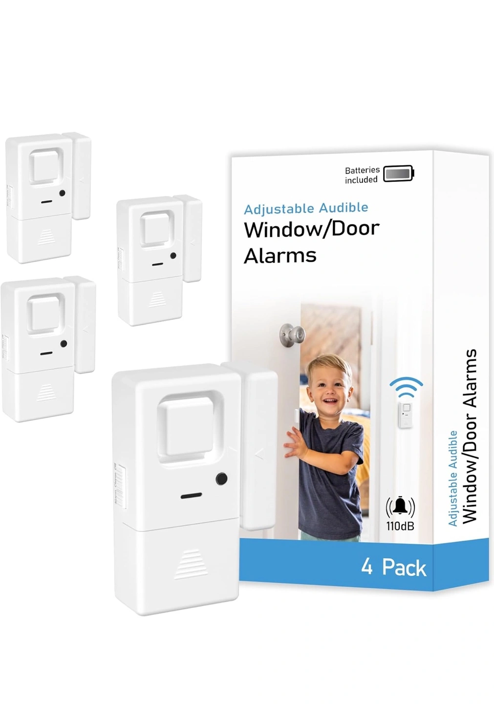 Four-pack window/door alarms. Adjustable volume, 85dB to 110dB. Easy-to-use OFF/CHIME/ALARM switch. Powered by LR44 batteries. Compact and loud.