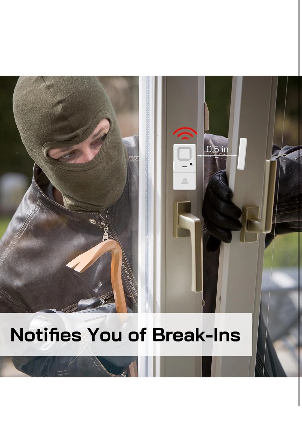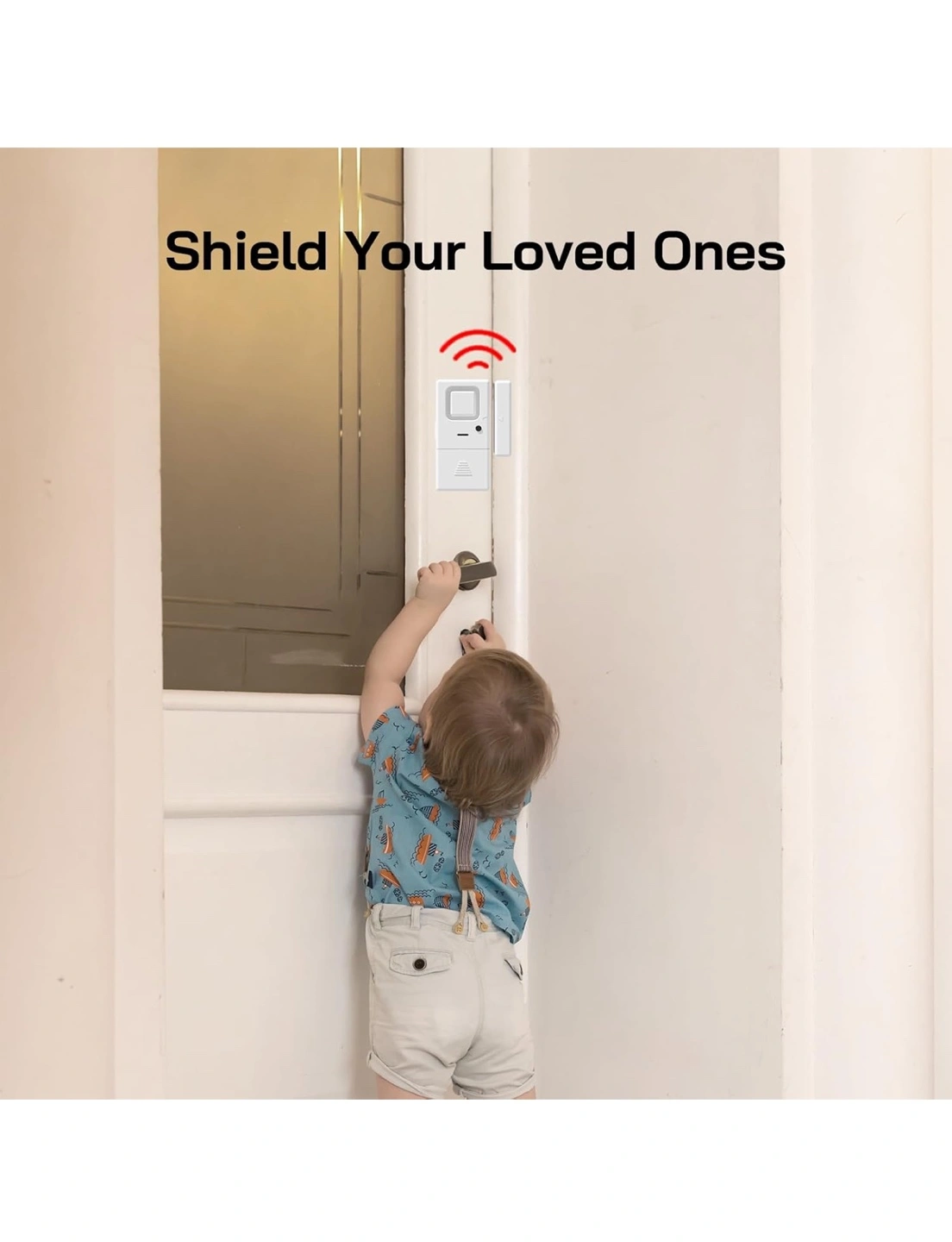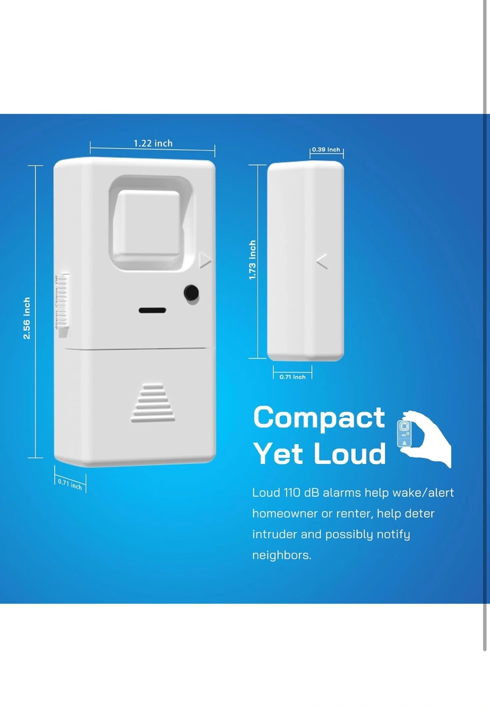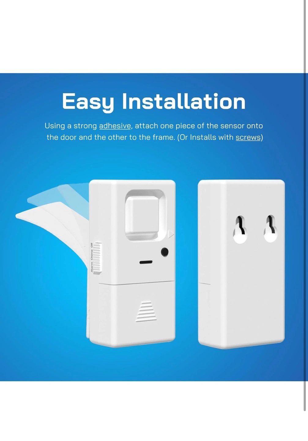 Four-pack window/door alarms. Adjustable volume, 85dB to 110dB. Easy-to-use OFF/CHIME/ALARM switch. Powered by LR44 batteries. Compact and loud.