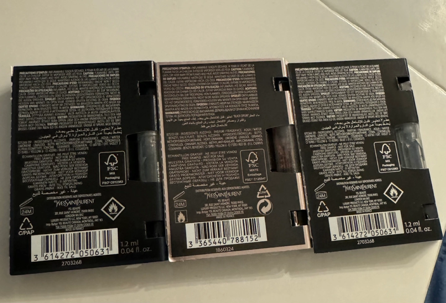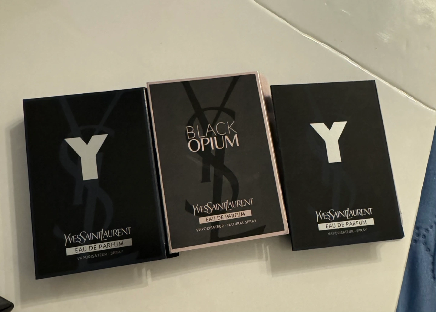 Three Yves Saint Laurent perfume samples. Includes Black Opium and Y fragrances. 1.2ml each. New, never sprayed.