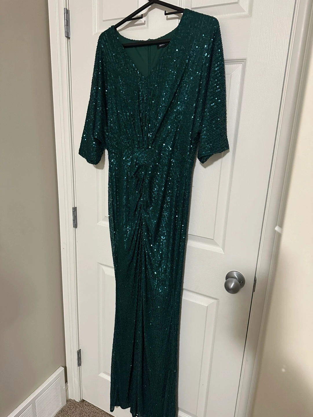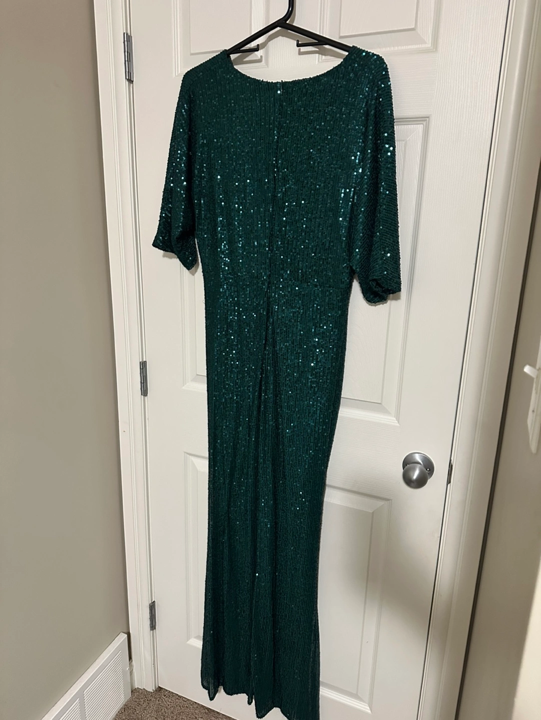 Stunning dark green sequin maxi dress. Features a flattering silhouette and half sleeves. Perfect for a special occasion. Elegant and eye-catching.