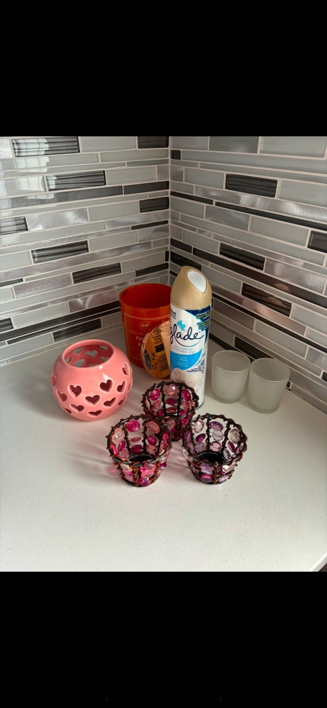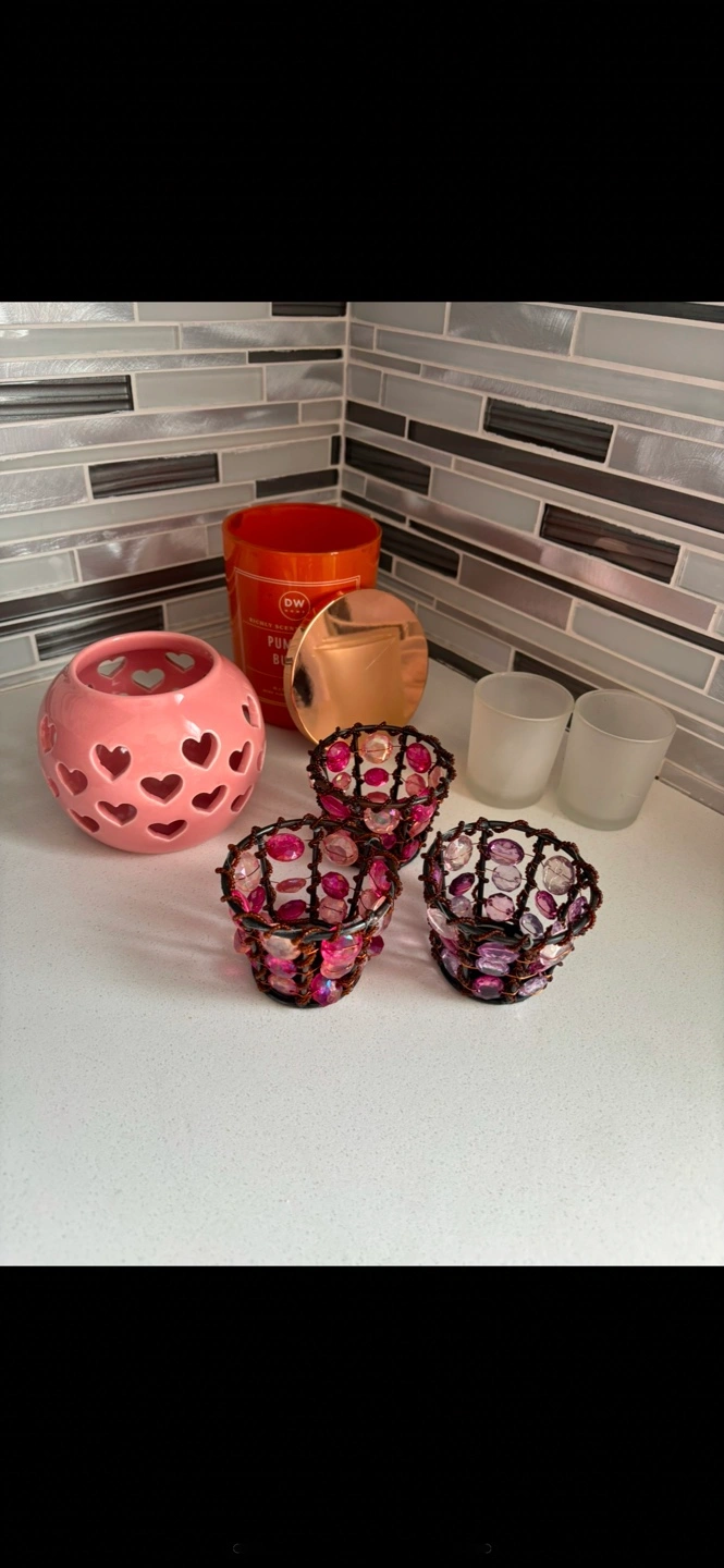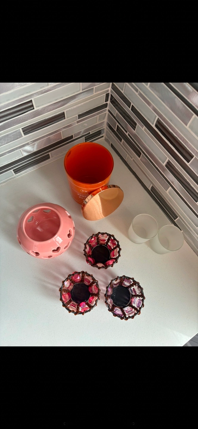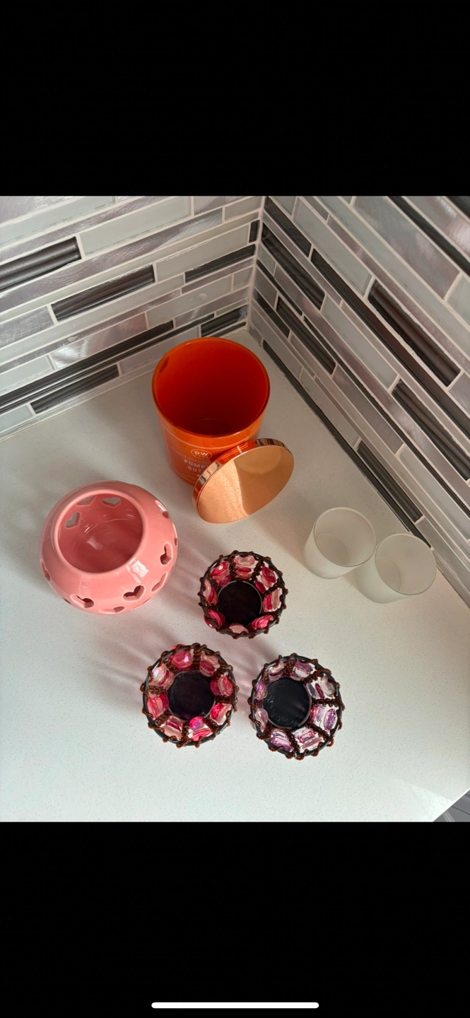 Assortment of candle holders and votives. Includes pink ceramic heart-shaped holder, two small decorative wire holders with coloured beads, and two frosted glass votives. One orange DW Home candle container also included (empty). Smoke free pet free home Pick up can be Rathburn and the west mall area Or Symington and DuPont