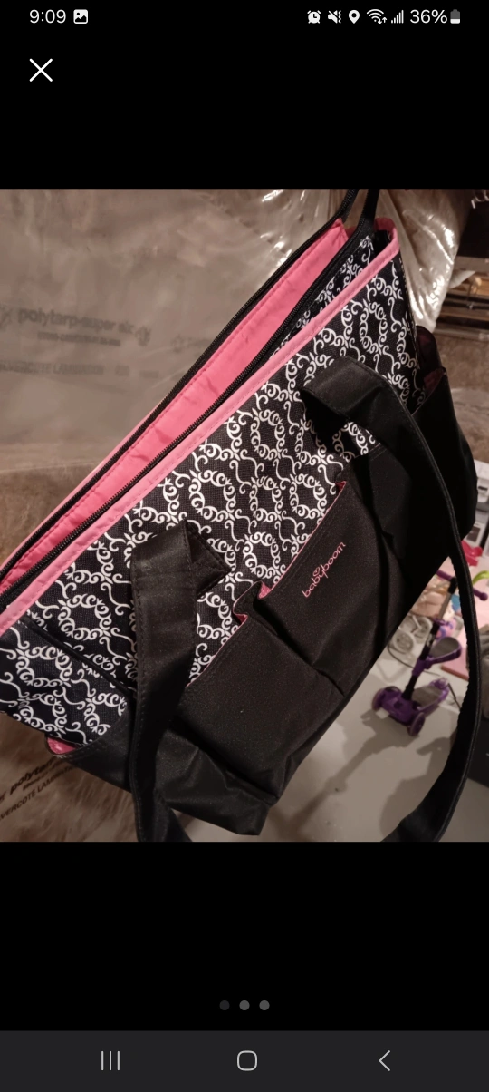 Black and white patterned diaper bag. Pink accents. Multiple pockets. Shoulder strap.