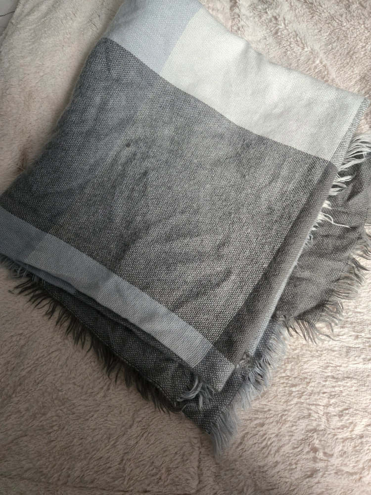 Soft scarf. Grey, white, and light blue plaid pattern. Fringed edges. Perfect for fall and winter.