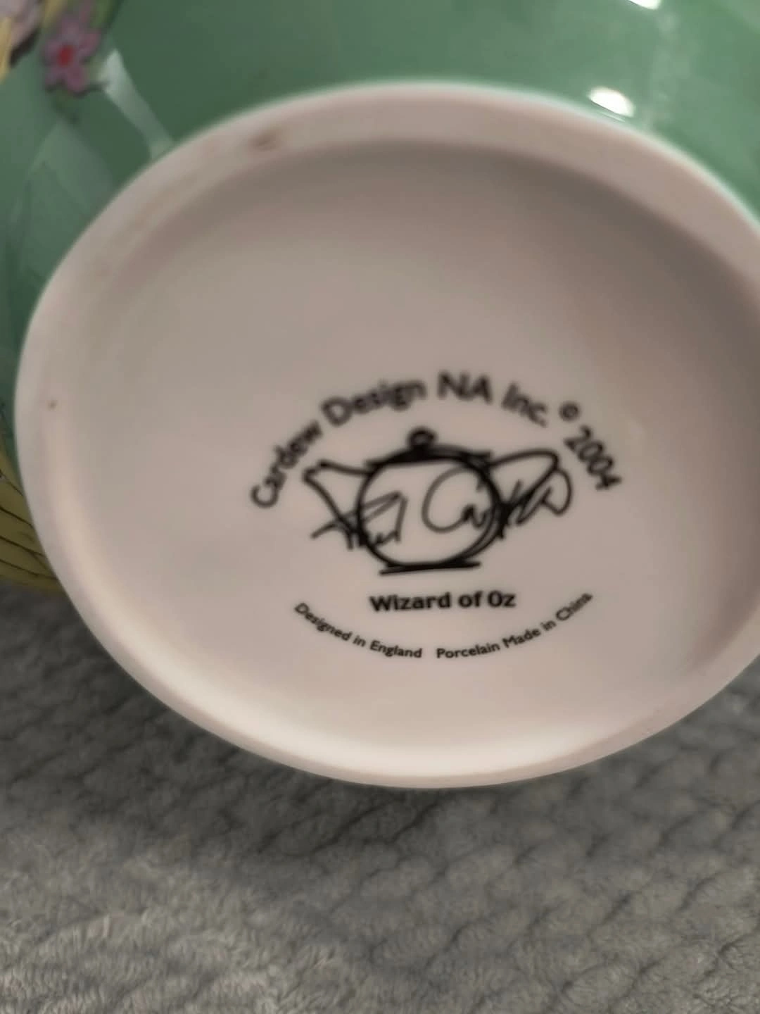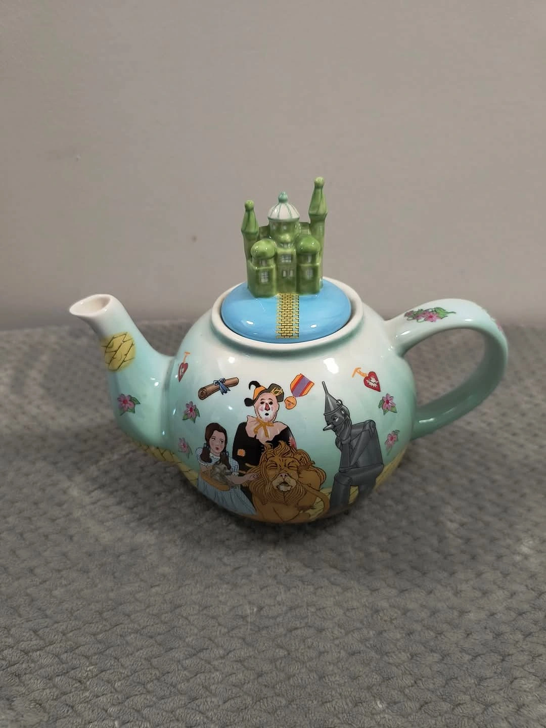Charming Wizard of Oz teapot. Features iconic characters and Emerald City. Porcelain teapot. Designed in England. Made in China. Collectible item.