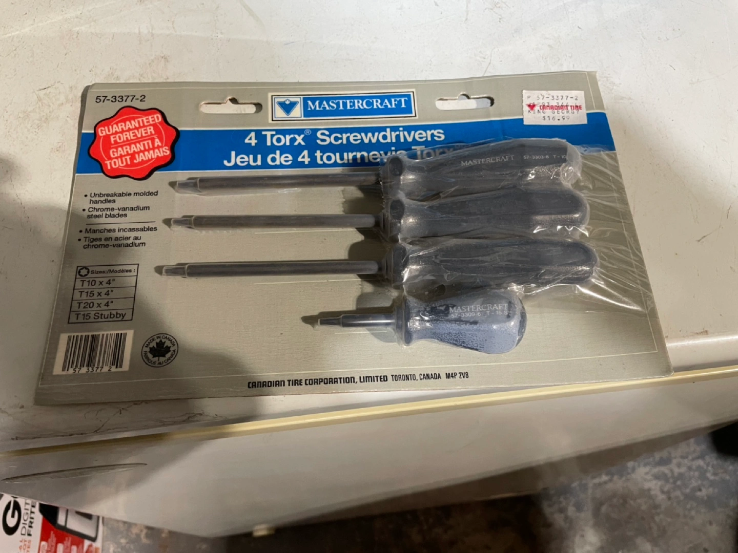 New, sealed package. Four Torx screwdrivers, various sizes. Unbreakable molded handles. Chrome-vanadium steel shafts. Made in Canada.