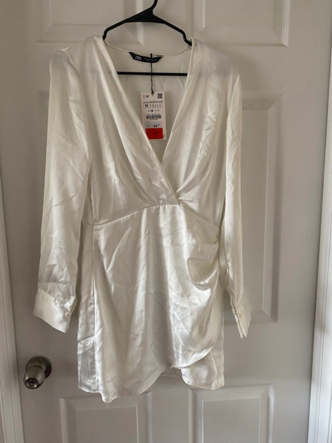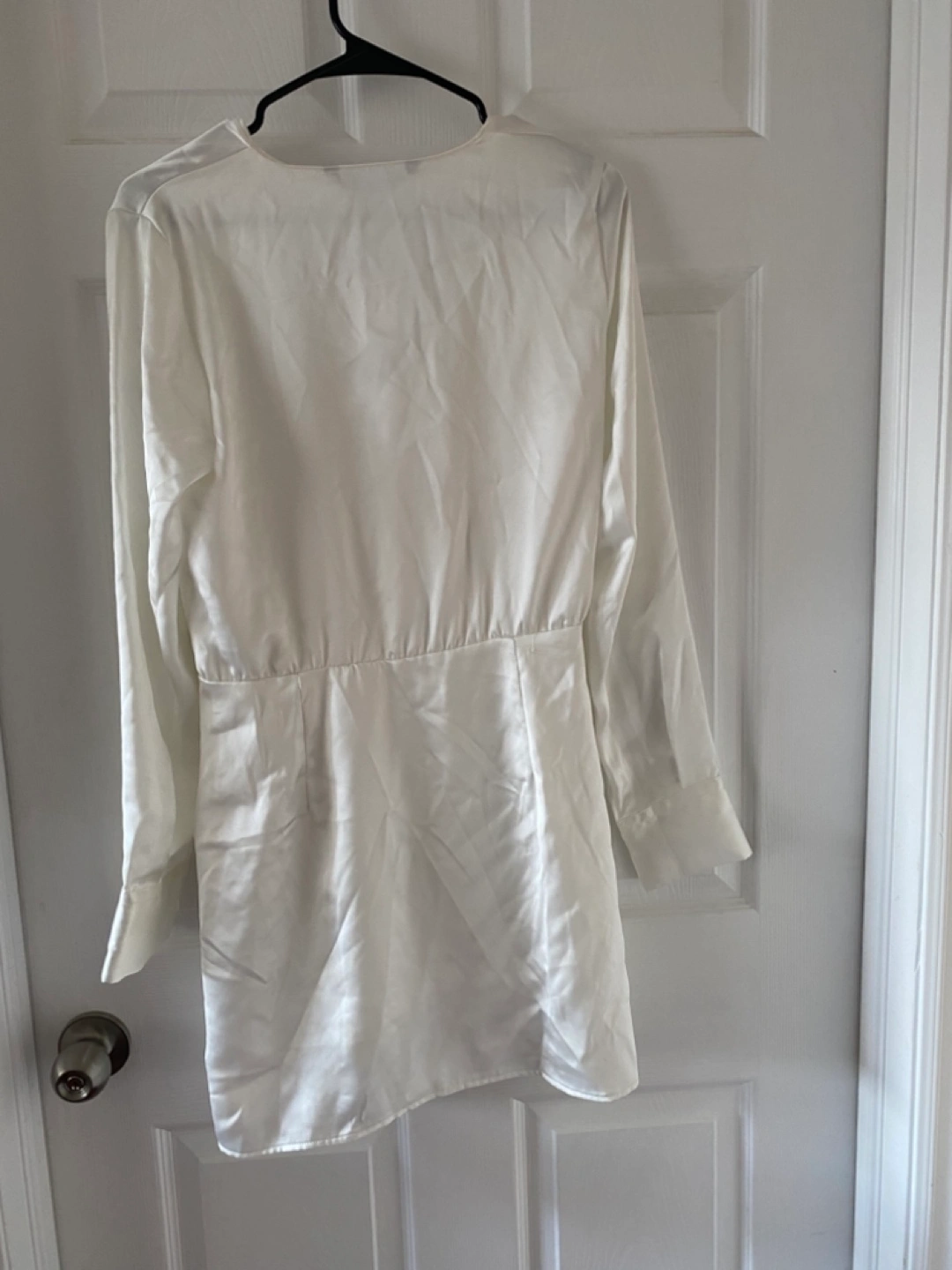 Beautiful white satin mini dress. Long sleeves, wrap style. Size Medium. Excellent condition. Cash Only