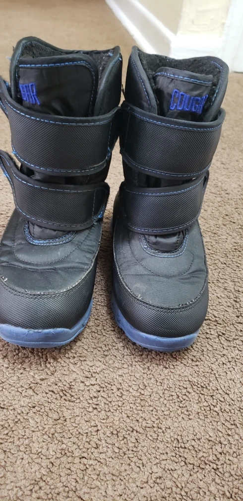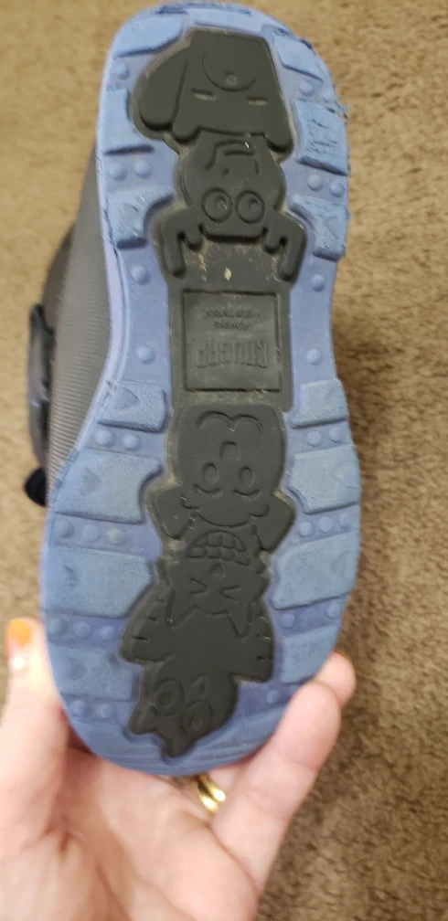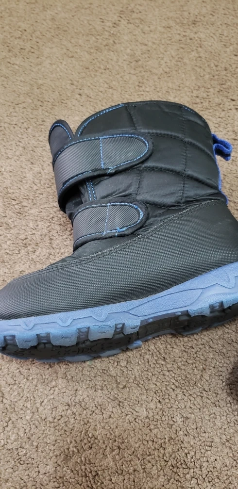 Black winter boots with blue accents. Hook and loop closures. Fun cartoon character designs on soles. Size 12