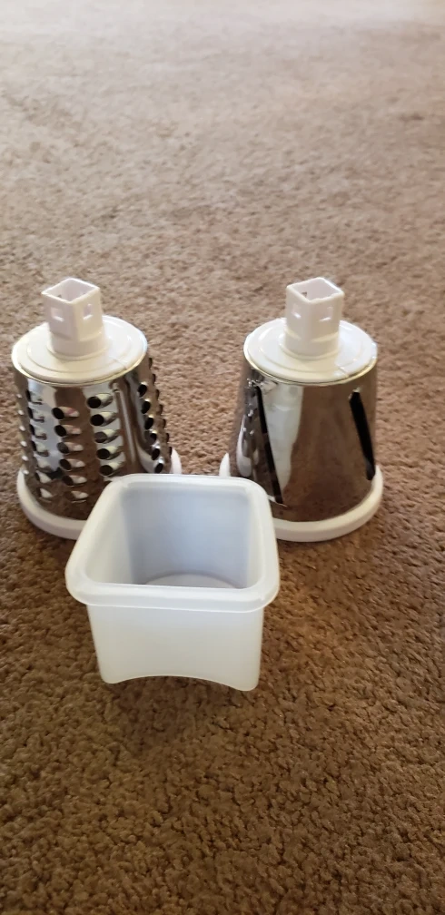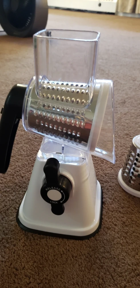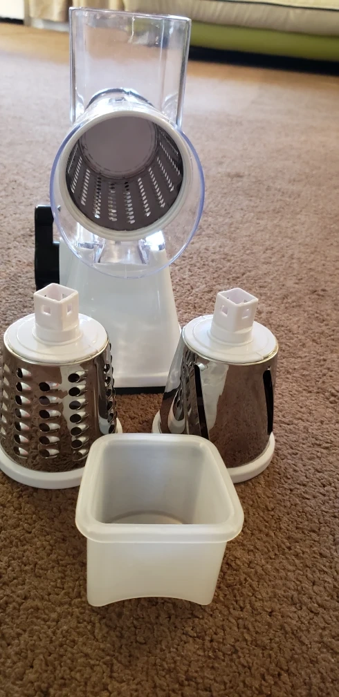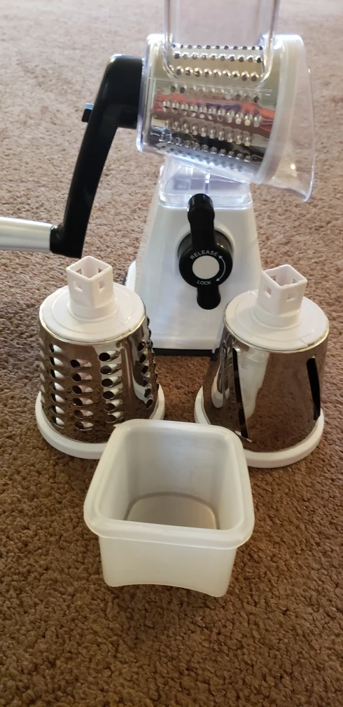 Hand-crank vegetable slicer. Includes multiple interchangeable stainless steel blades and a food collection container. Easy to use and clean.