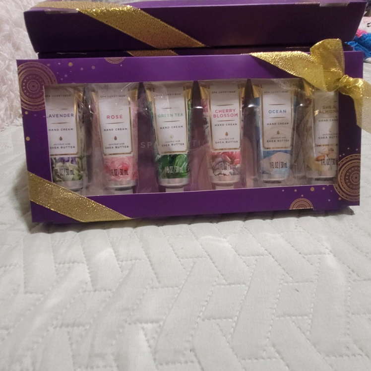 Six assorted hand creams. Lavender, rose, green tea, cherry blossom, ocean, and shea almond scents. Enriched with shea butter. 1 fl oz tubes.