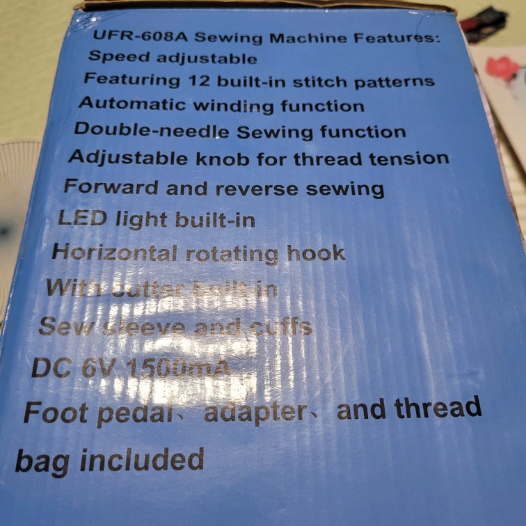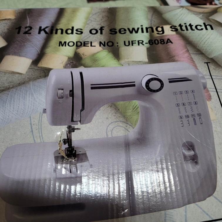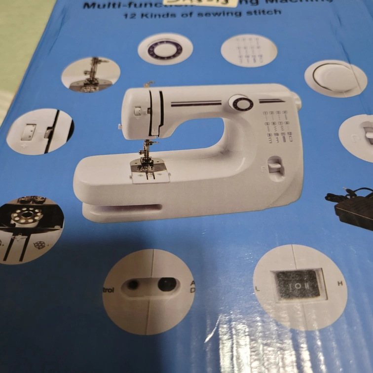Mini sewing machine. Features 12 built-in stitch patterns, automatic winding function, adjustable speed, and double-needle sewing. Includes foot pedal, adapter, and thread bag. LED light and horizontal rotating hook.