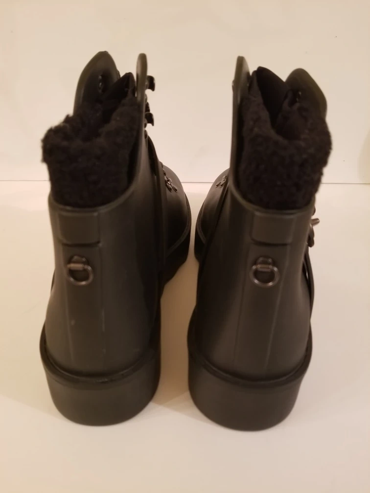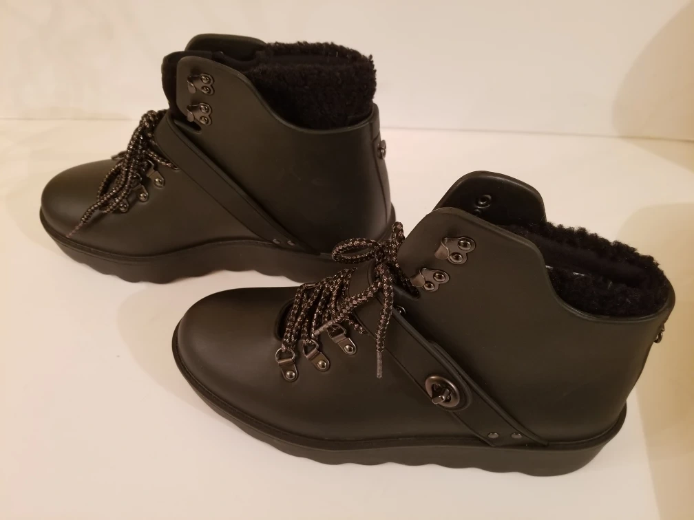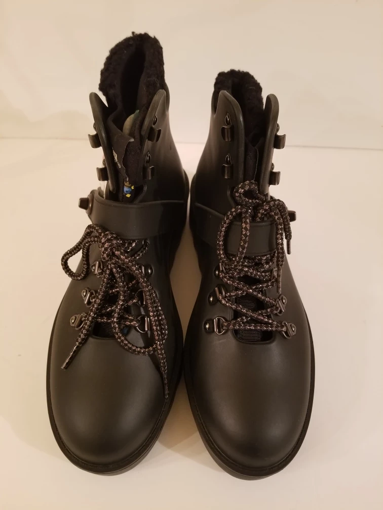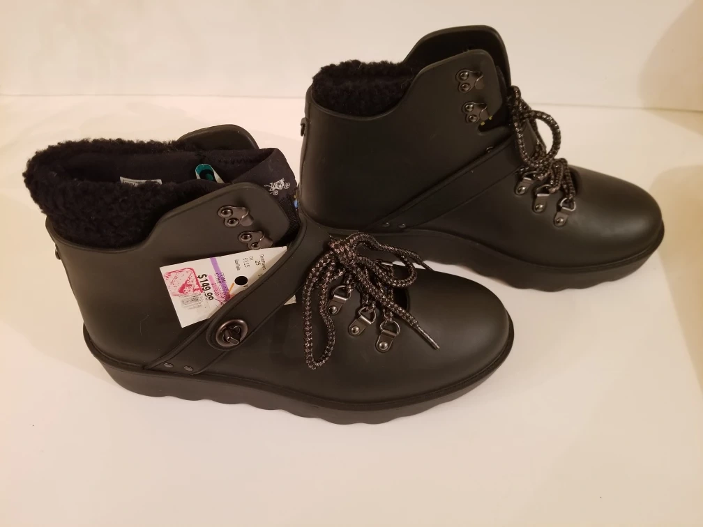Black rubber boots. Lace-up style. Features a sherpa-lined interior. SIZE: US 7.5-8 Extremely Lightweight and comes with removable winter insole Easy to wear, water resistance, and gender Neutral Sells for $150-$279 Retail Yours for $50