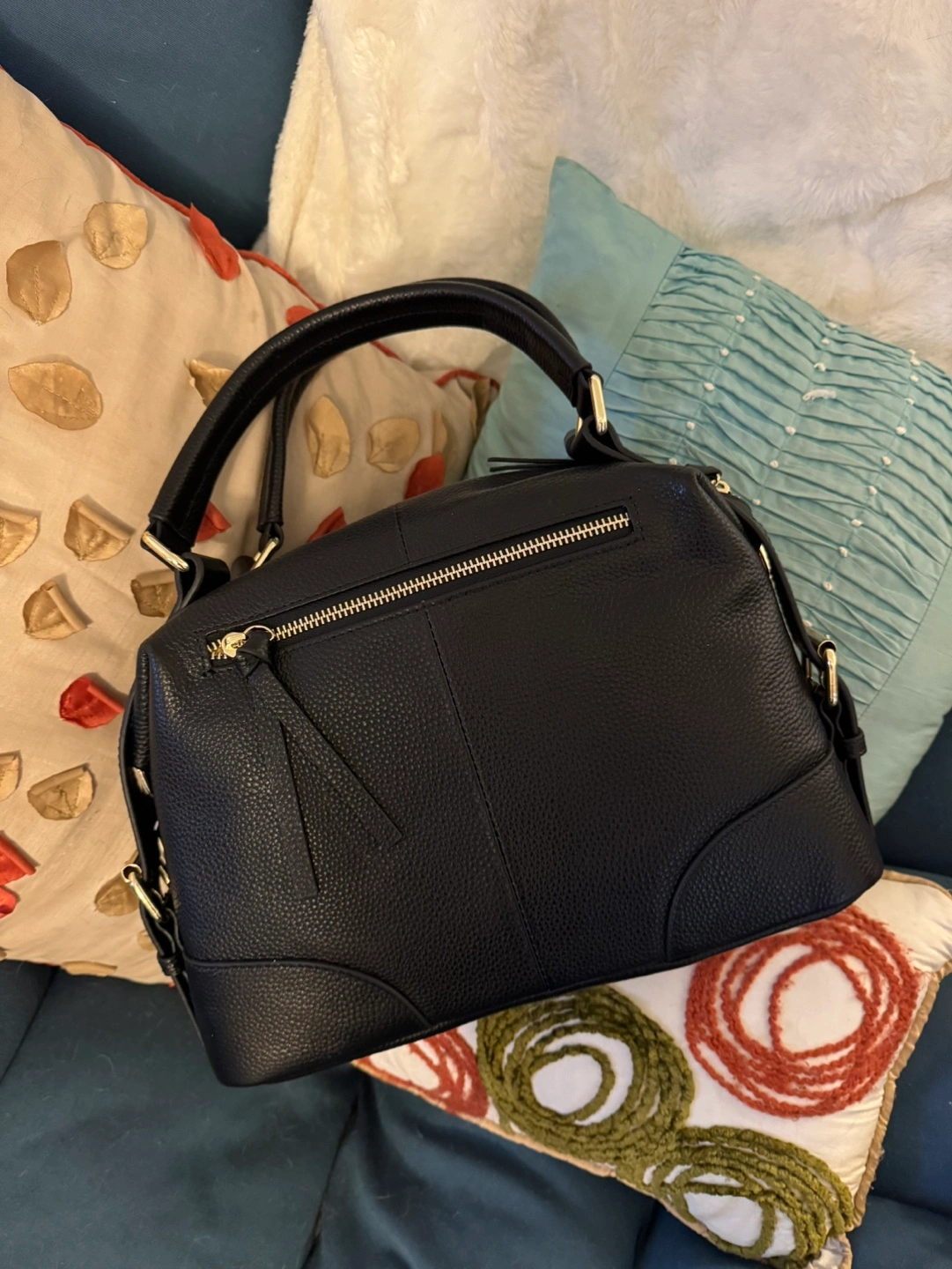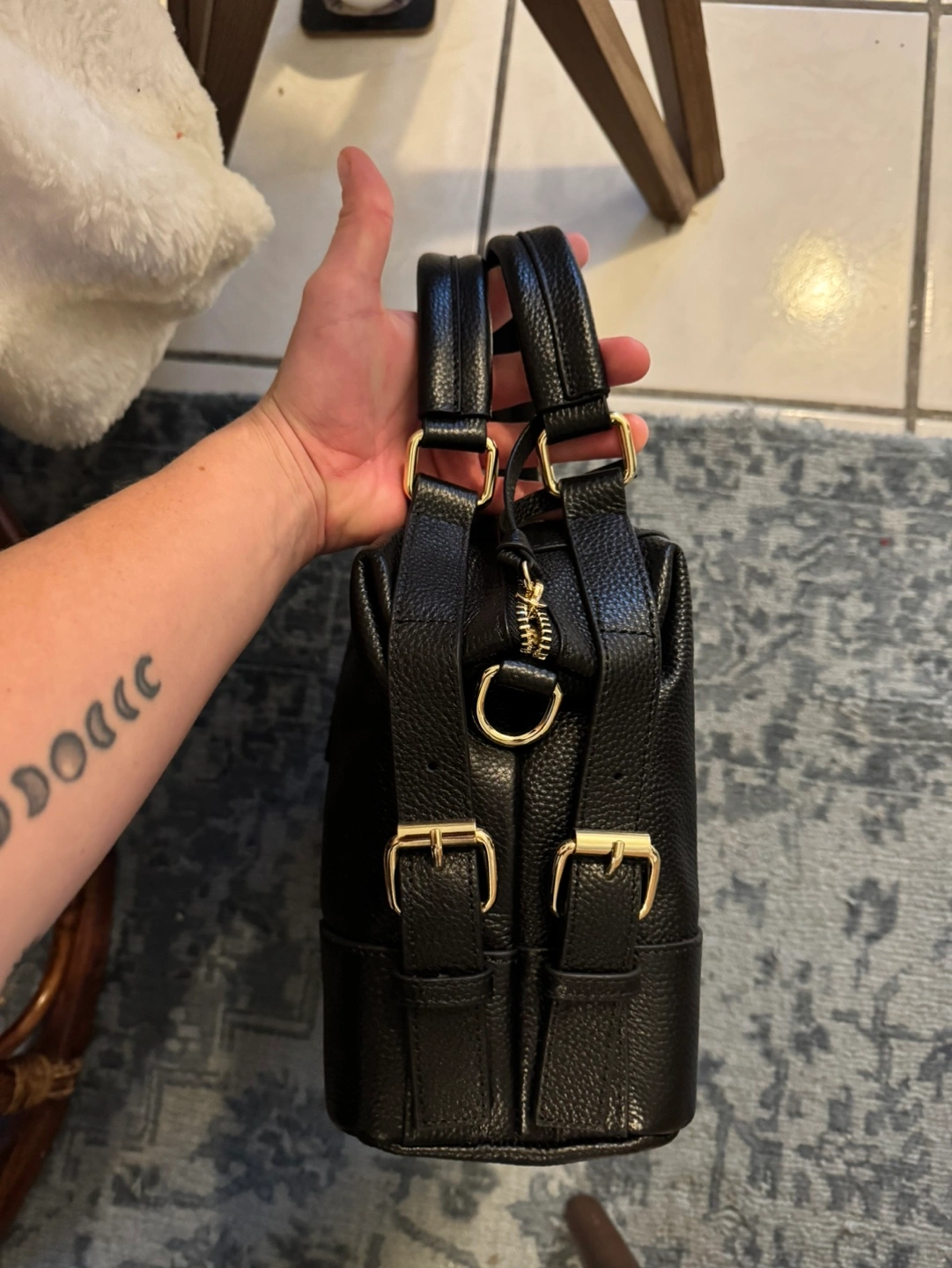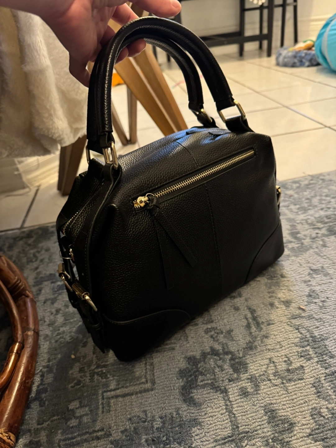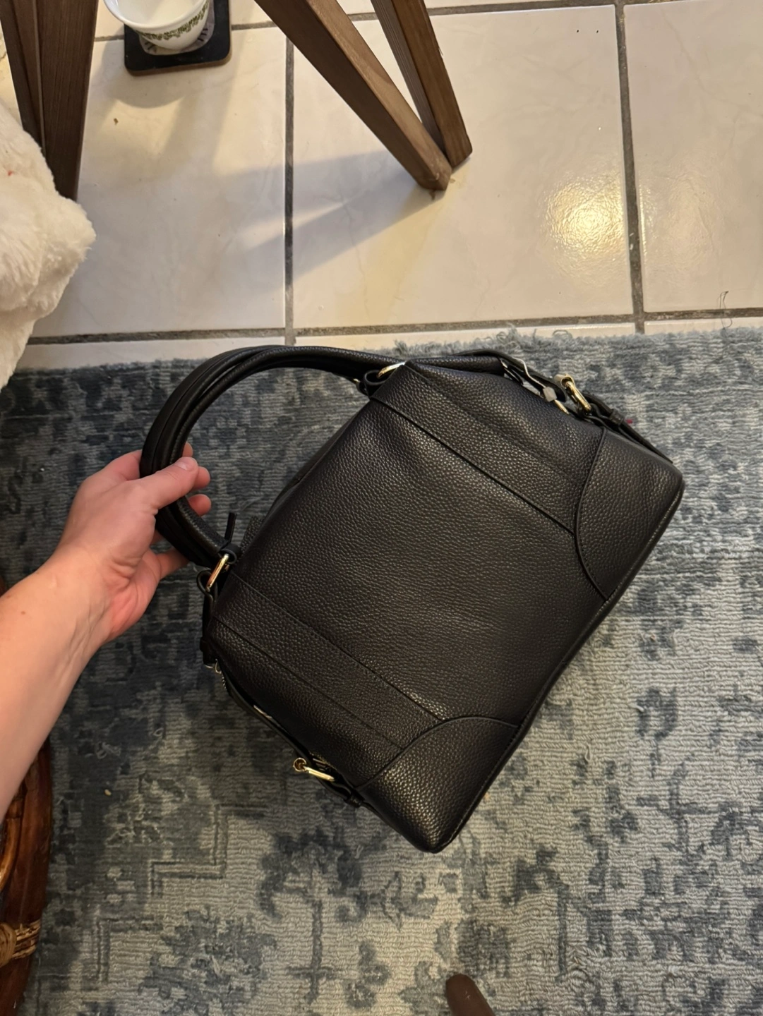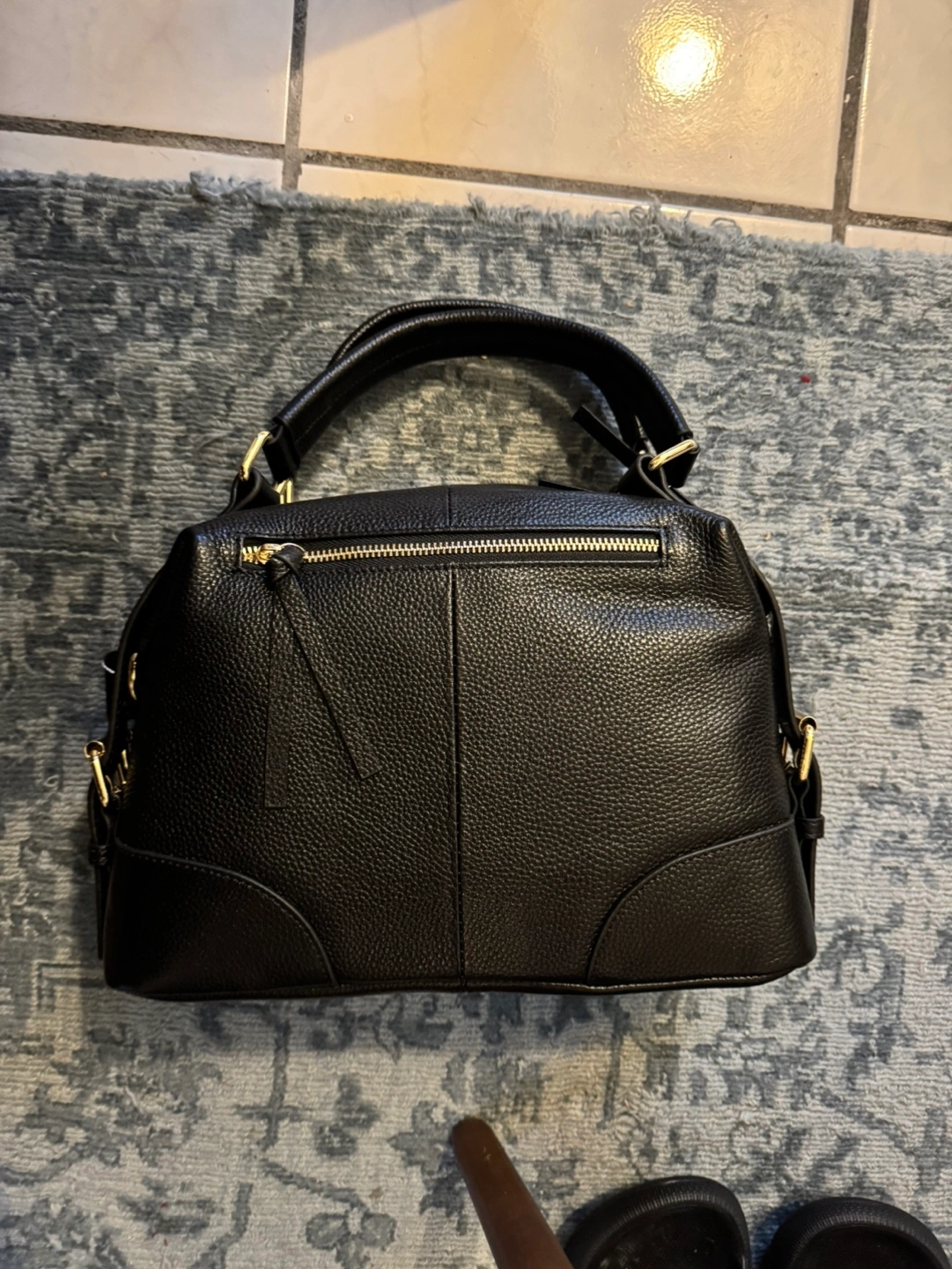Stylish black leather handbag. Features top handles and adjustable straps. Gold-toned hardware. Zipper closure. Large but compact, perfect for everyday use. Comes with additional long strap for cross body wear. Brand new, never used. Dimensions: 12” x 8” x 5”