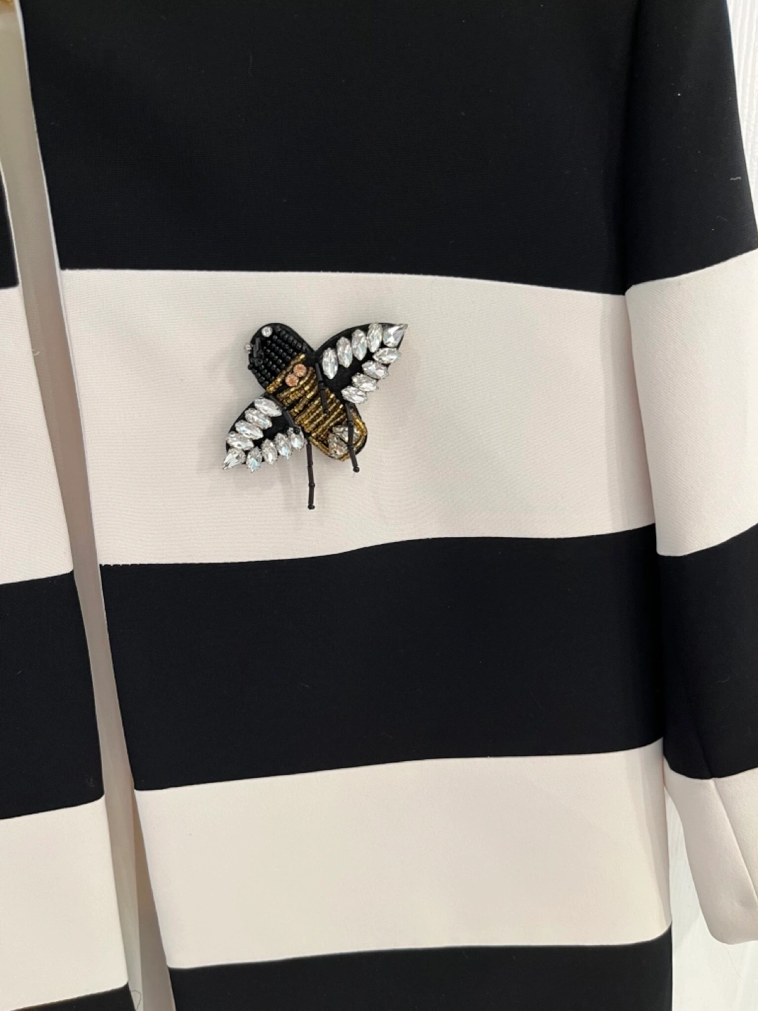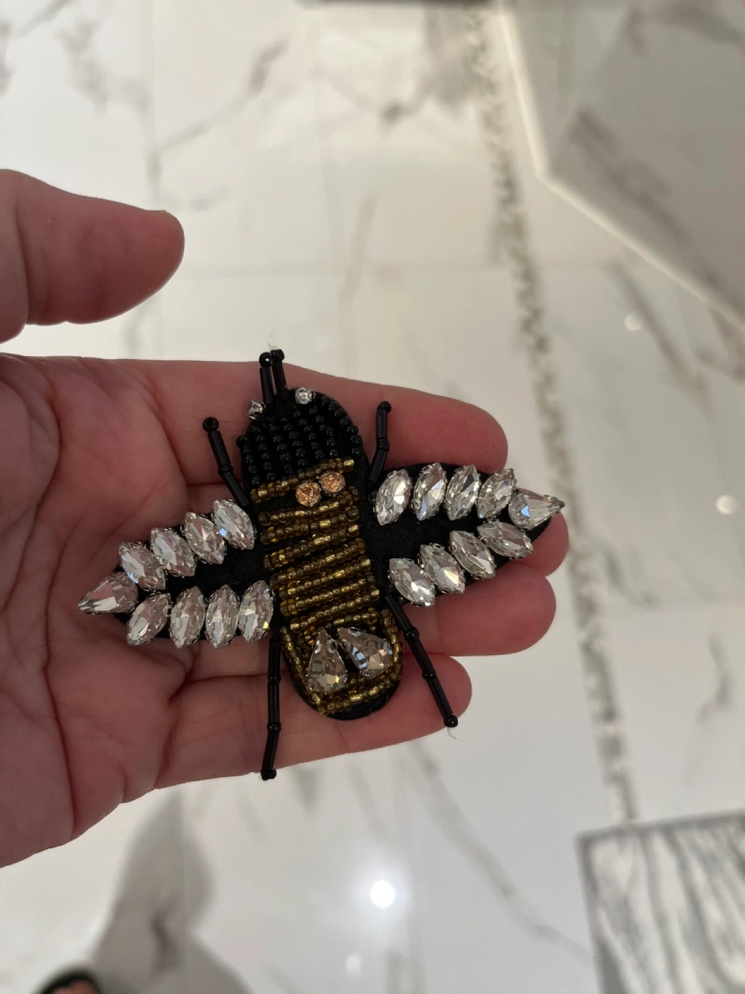 Beaded bee brooch. Black and gold embroidery. Clear rhinestone accents. Perfect for adding a unique touch to your outfit. Cash only