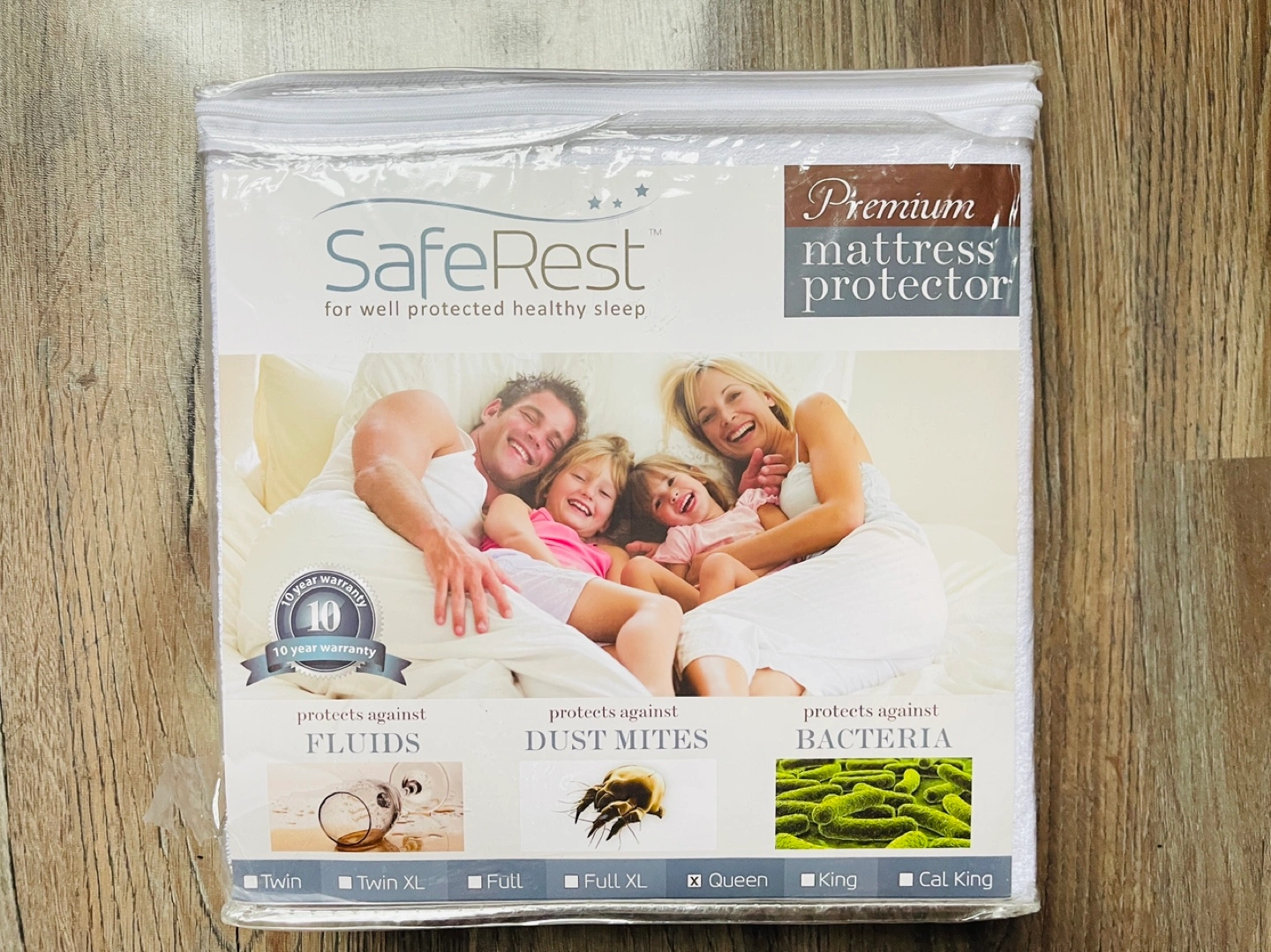 SEALED Saferest Waterproof mattress protector. Queen size. Fitted style. Machine washable. Protects against fluids, dust mites, and bacteria. Breathable and hypoallergenic. Price firm already more than 50%discount from retail price Pick up near Yonge Eglinton