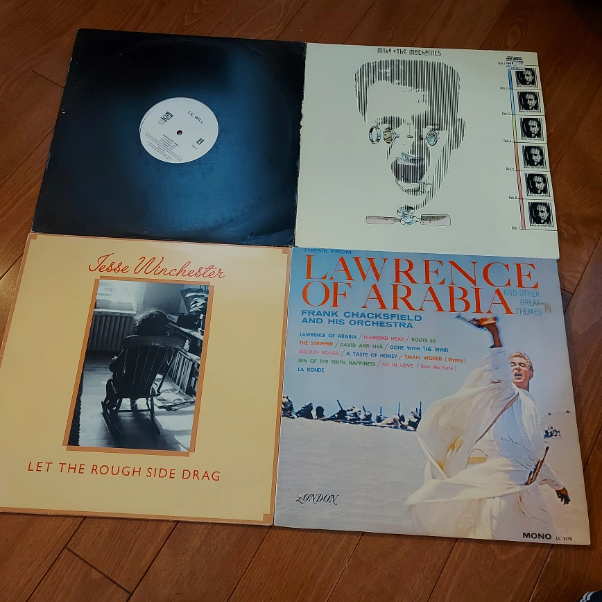 Four vinyl records. $5 each. Includes Jesse Winchester's Let the Rough Side Drag, Mike + The Mechanics' album, Lawrence of Arabia and Other Great Themes, and a Lil Will record. Pre-owned, shows some wear. I've played all but Lawrence of Arabia - it's shows a lot more wear and tear and could use a clean. Cash only and pick up Pape Station.