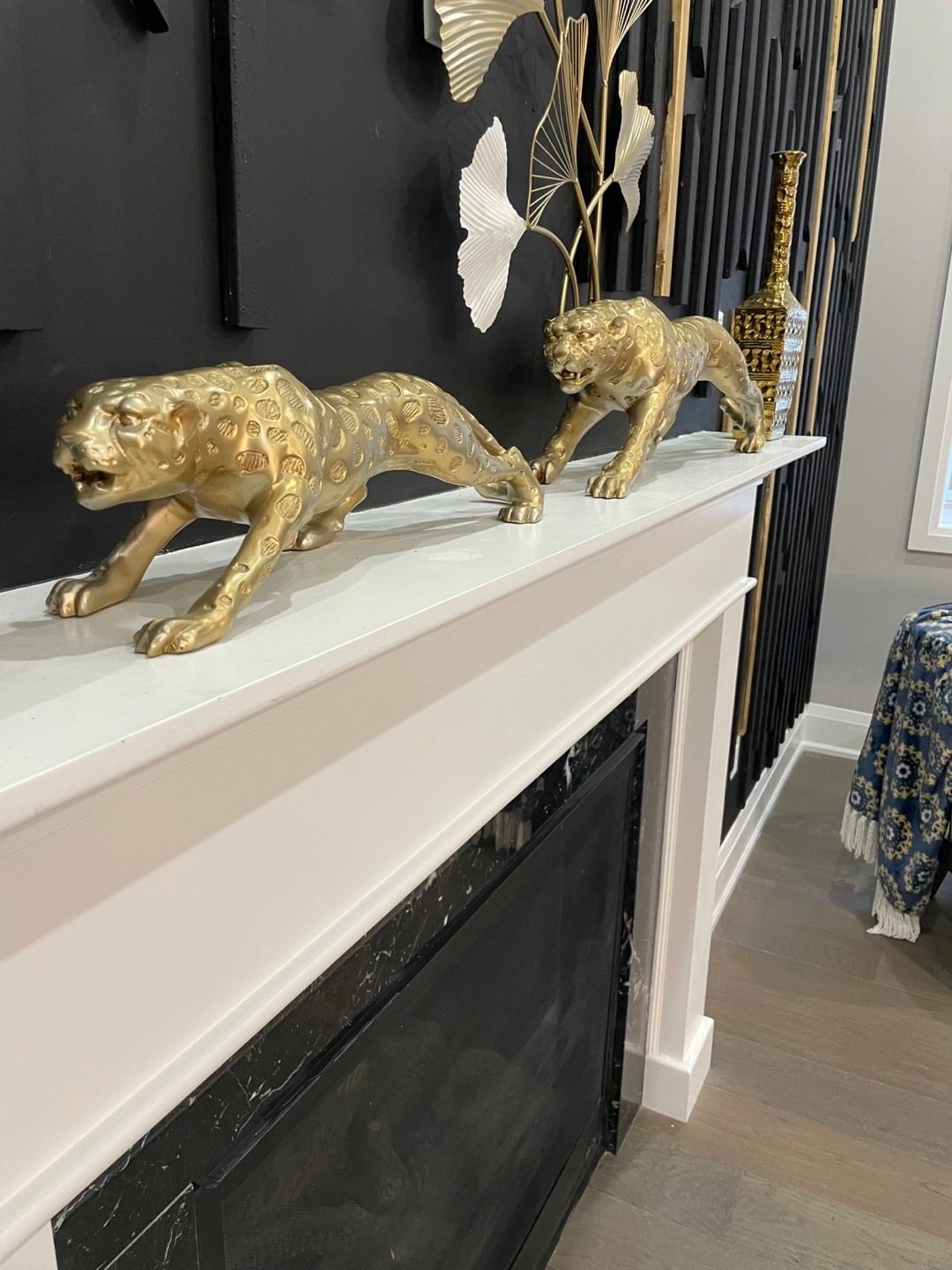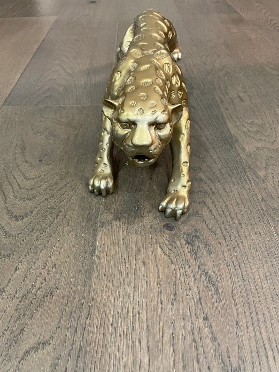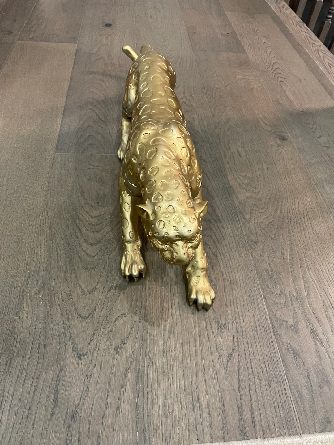 Gorgeous set of two gold leopard figurines. Smaller and larger sizes. Great for home décor. Adds a touch of glamour. 1. 33 x 6 inch 2. 24 x 5 inch L x W