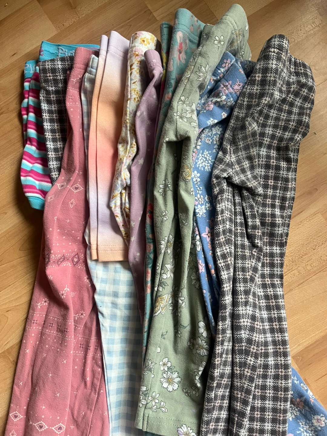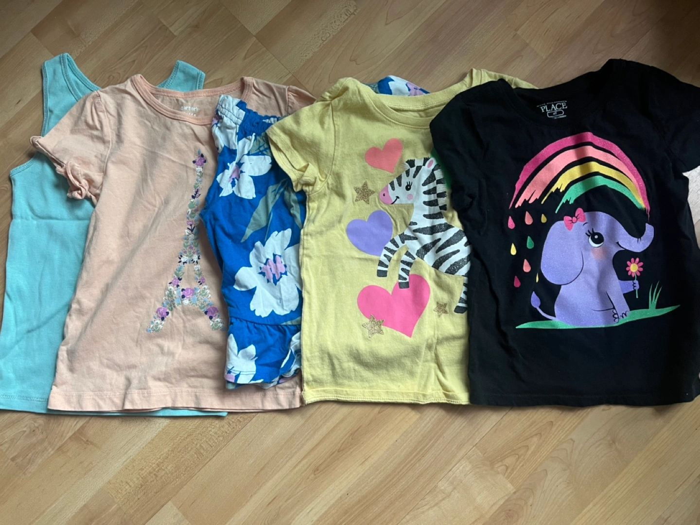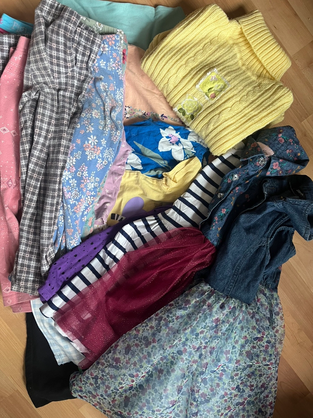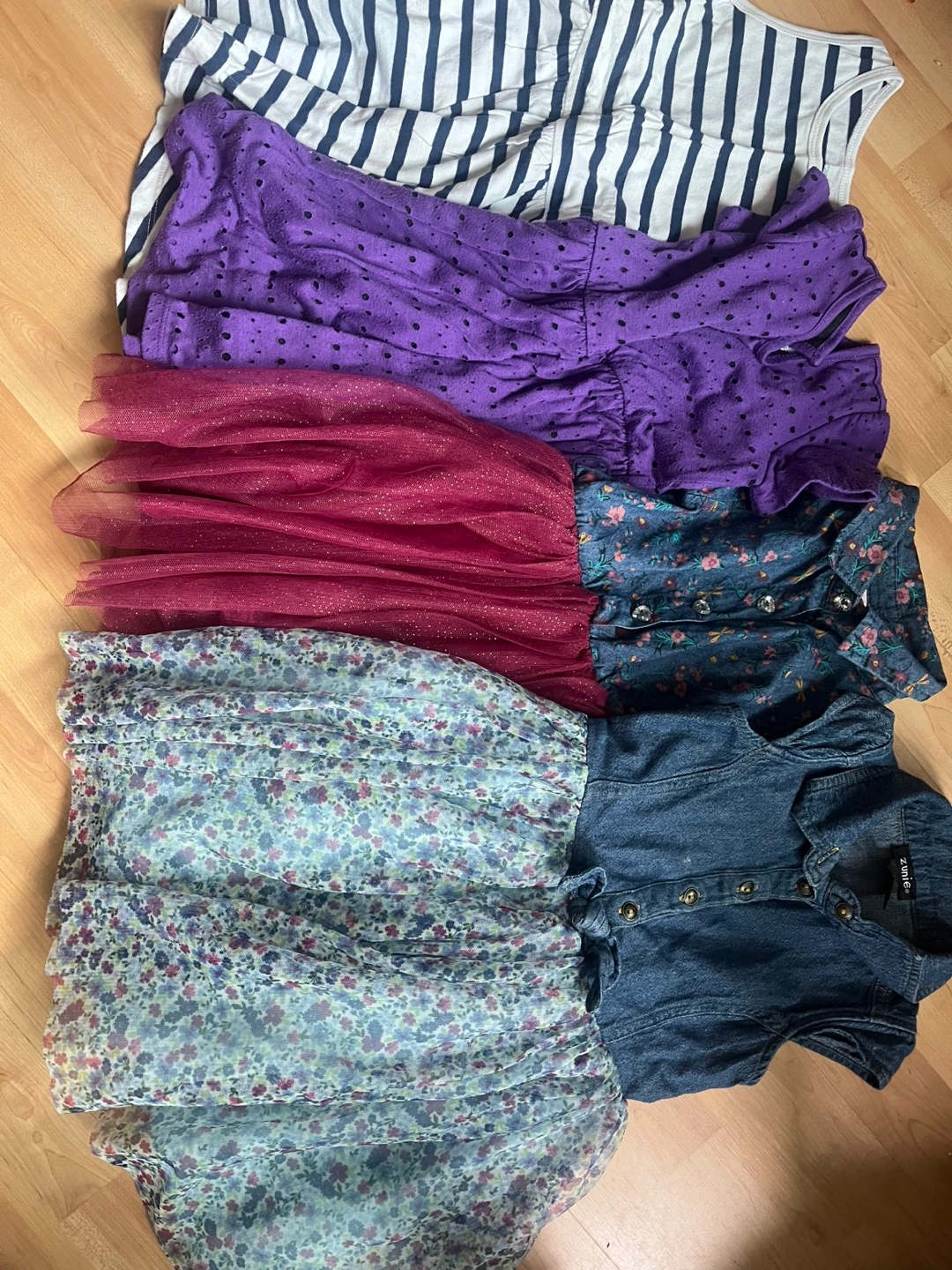 Large bundle of girls' clothing. Includes tops, dresses, leggings, and a sweater. Various colours and patterns. Sizes approximately 4-5 years. Gently used Pet free, smoke free home