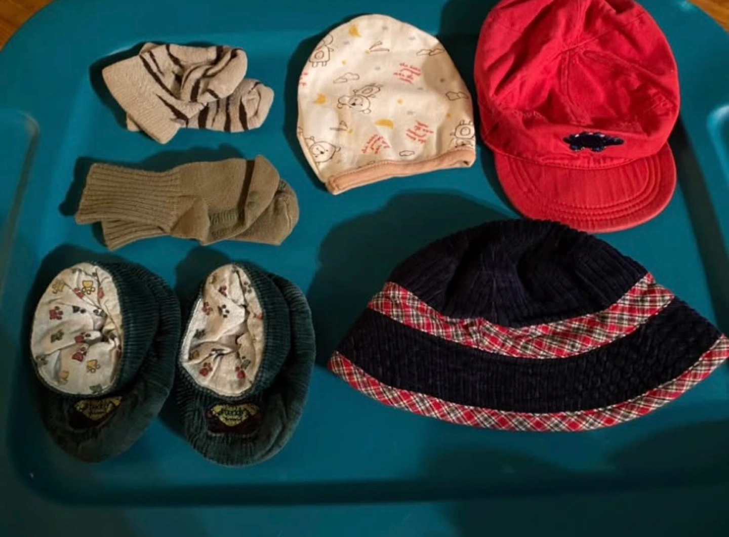 Adorable baby clothes bundle. Includes three hats, two pairs of socks, and a pair of booties. No delivery. No holds. As is, no refunds. Price is firm. Size newborn