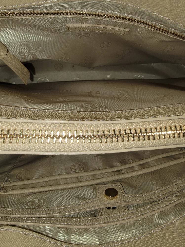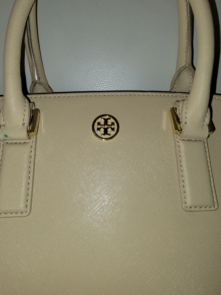 Beautiful beige leather handbag. Features gold-toned hardware, a top handle, and a detachable shoulder strap. Interior has zipper closure and multiple pockets. 2 little markings -see pics.