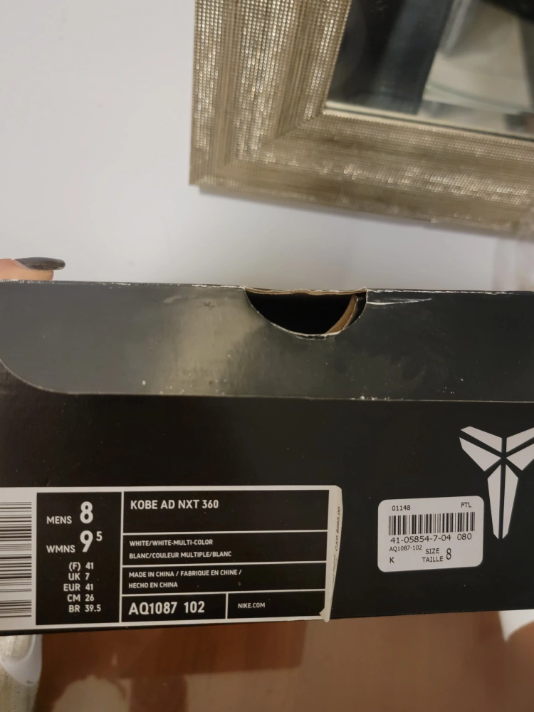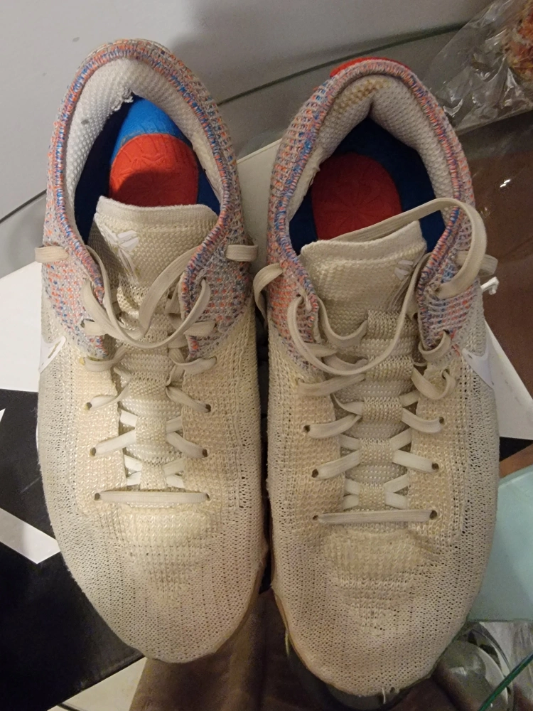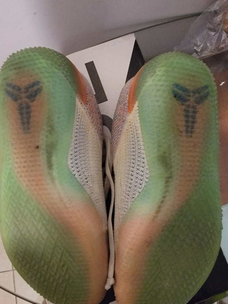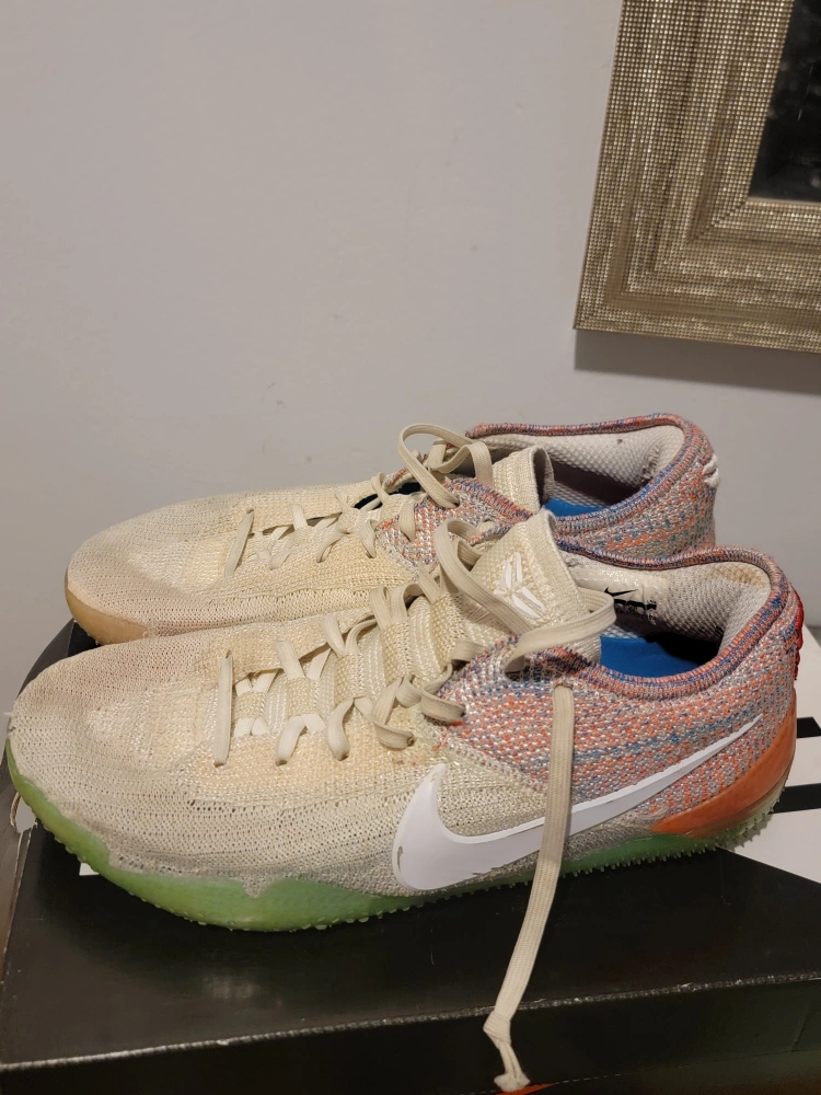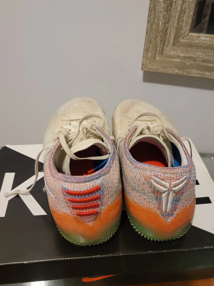 Used Nike Kobe A.D. NXT 360 basketball shoes. Cream coloured knit upper. Multicoloured accents inside. Orange and green outsole. Some wear and tear visible. Collectors item!