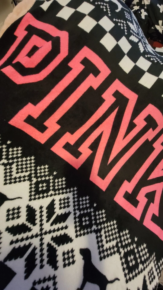 Cozy fleece throw blanket. Features a black and white checkered and snowflake pattern. Large PINK logo. Perfect for snuggling up on the couch.