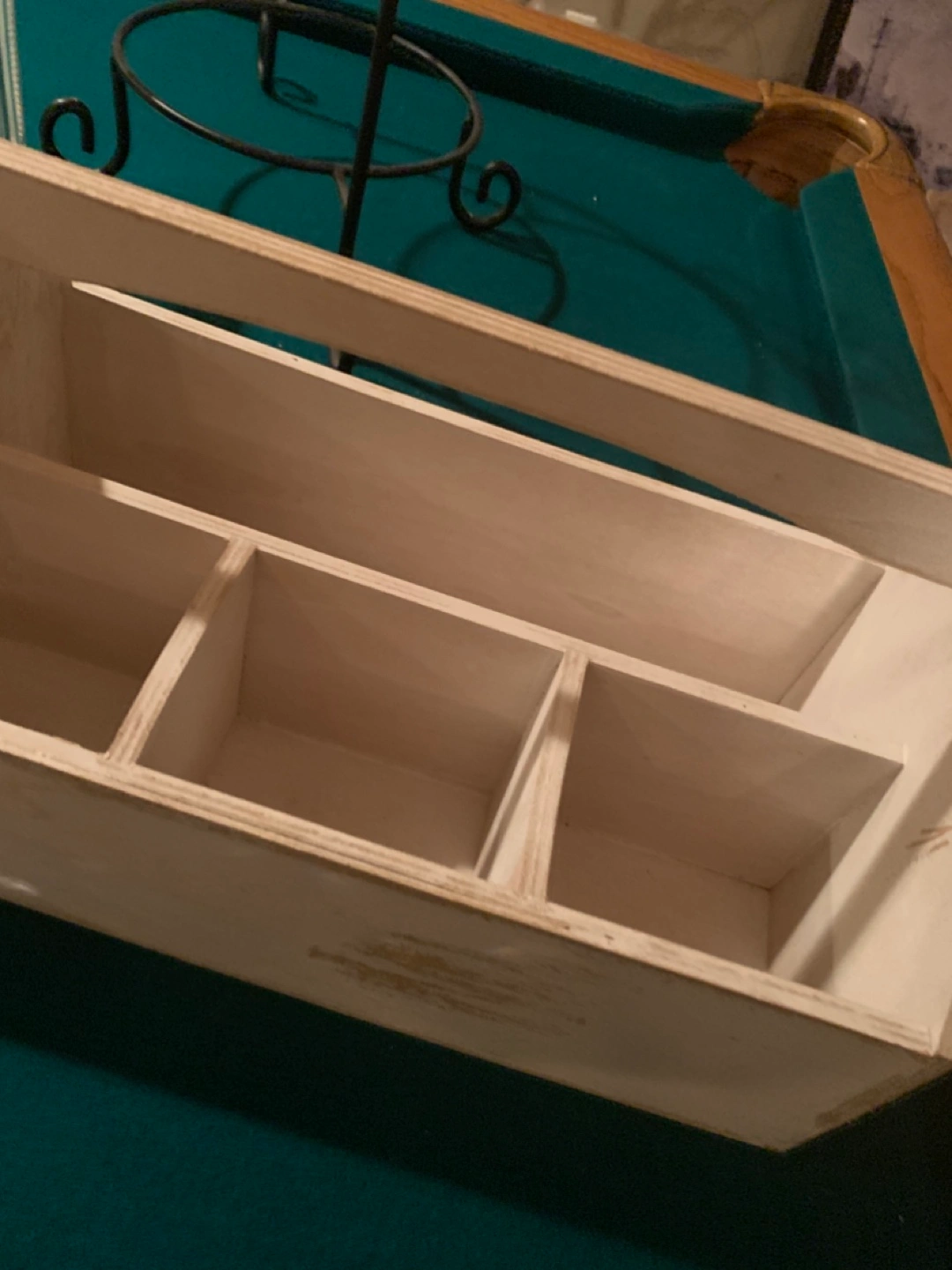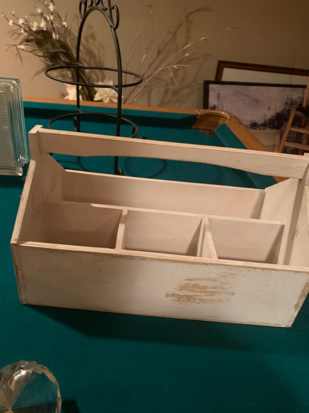 Rustic white wooden caddy. Four compartments. Perfect for organizing utensils, toiletries, or other small items. Distressed finish. Carry handle. McCowan and 16th porch pick up ONLY. Cash ONLY. *** MOVING SALE…. See all my other items. Many are only $5.