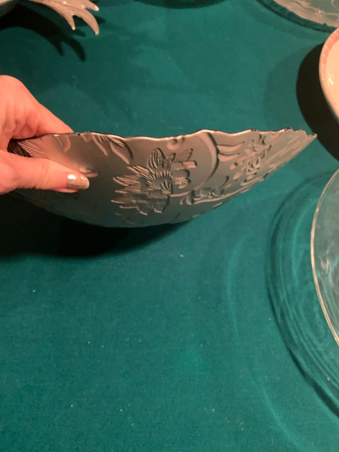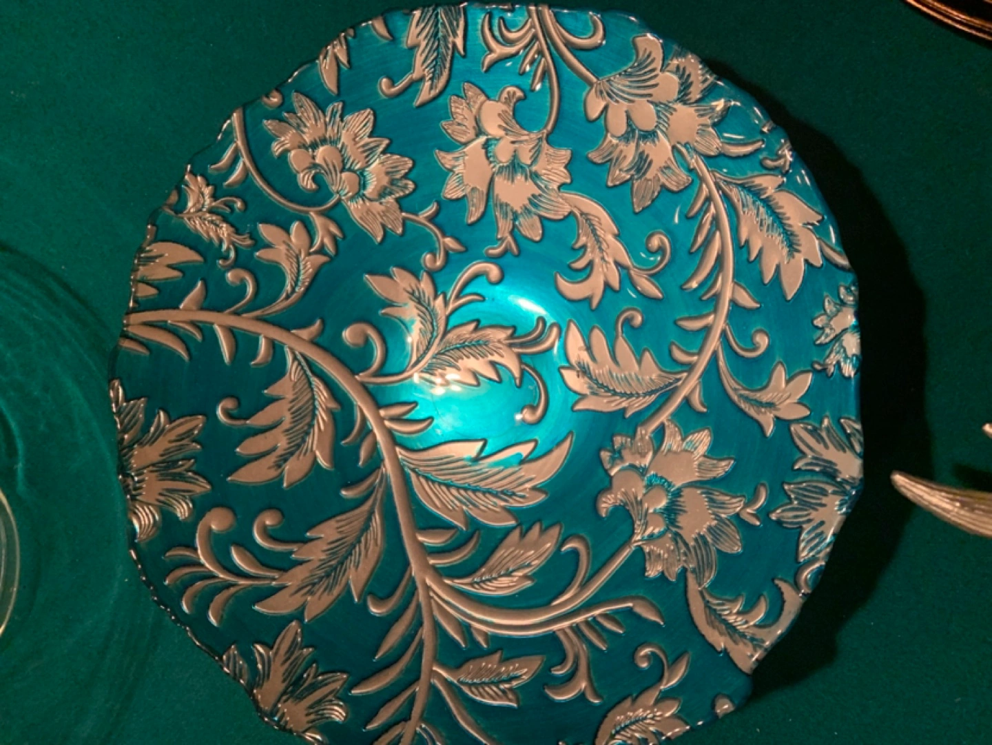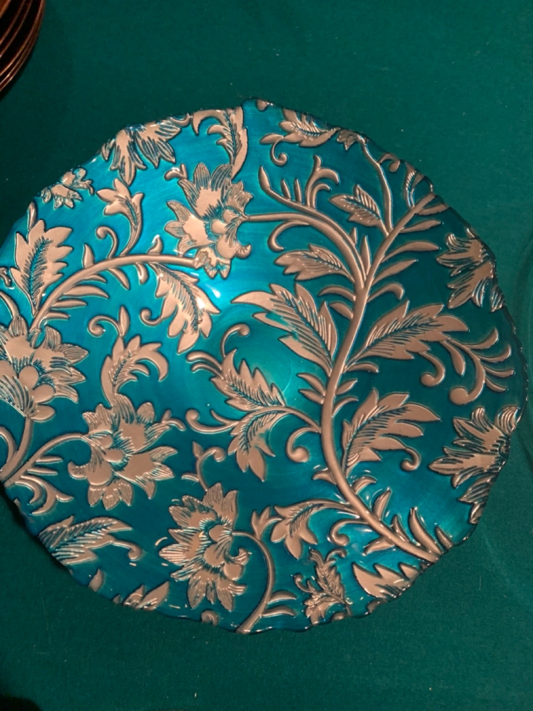 Beautiful teal glass bowl. Features an embossed silver floral design. Unique scalloped edge. Perfect for serving or decoration. *** MOVING SALE…. See all my other items. Many are only $5. McCowan and 16th porch pick up ONLY. Cash ONLY. *** MOVING SALE…. See all my other items. Many are only $5.